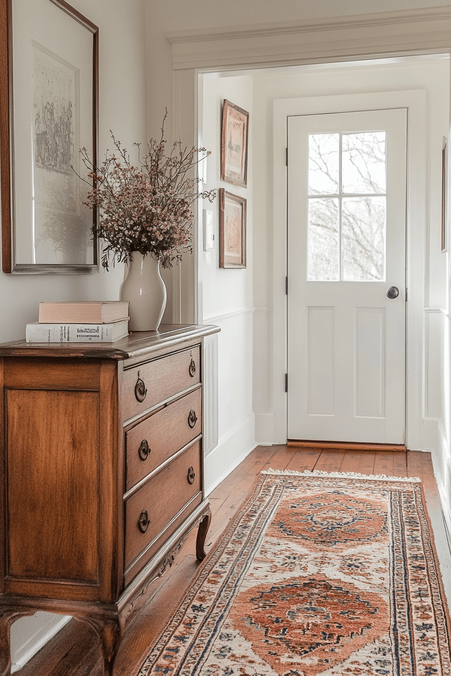 Hallways gain warmth through antique farmhouse decor with traditional runner rugs. Faded patterns and classic weaves protect floors while adding elegance. These textiles soften transitions between rooms. Designed for durability, they hold up to everyday foot traffic. Small details like these complete the home’s story.