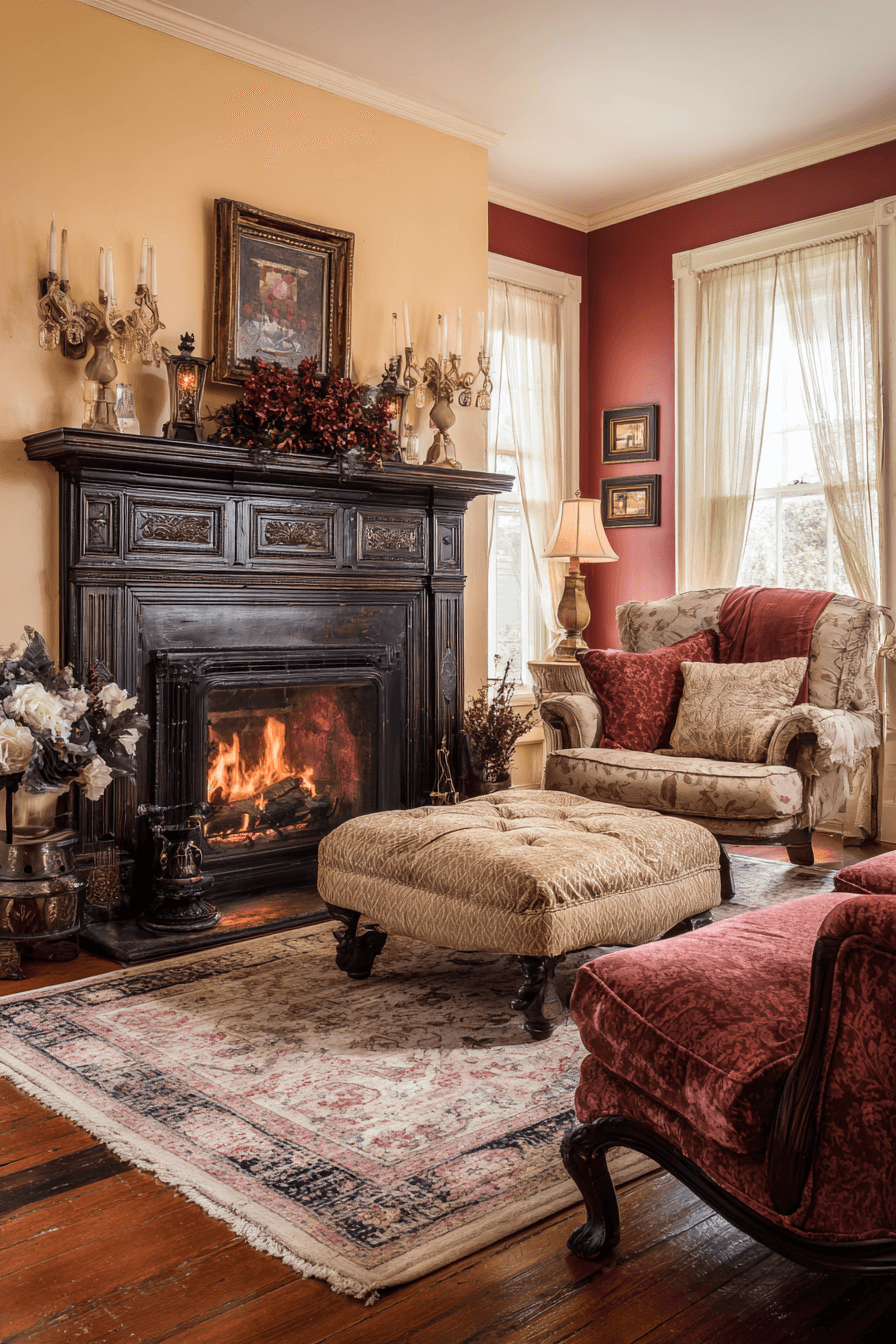 Fireplaces anchor rooms styled with antique farmhouse decor through warmth and architectural beauty. Original brick or stone surrounds provide texture and tradition. These hearths draw people together naturally. Whether lit or not, they serve as visual focal points. Comfort and character live side by side.