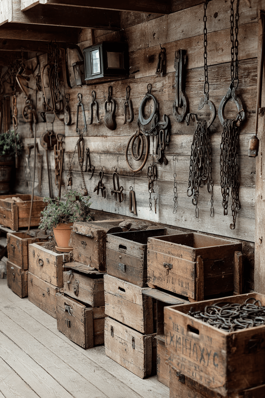 Garages benefit from antique farmhouse decor through vintage storage solutions. Wooden crates, cast iron hooks, and old toolboxes add organization with character. These elements honor craftsmanship while remaining practical. The space feels cohesive with the rest of the home. Even utility areas gain charm.