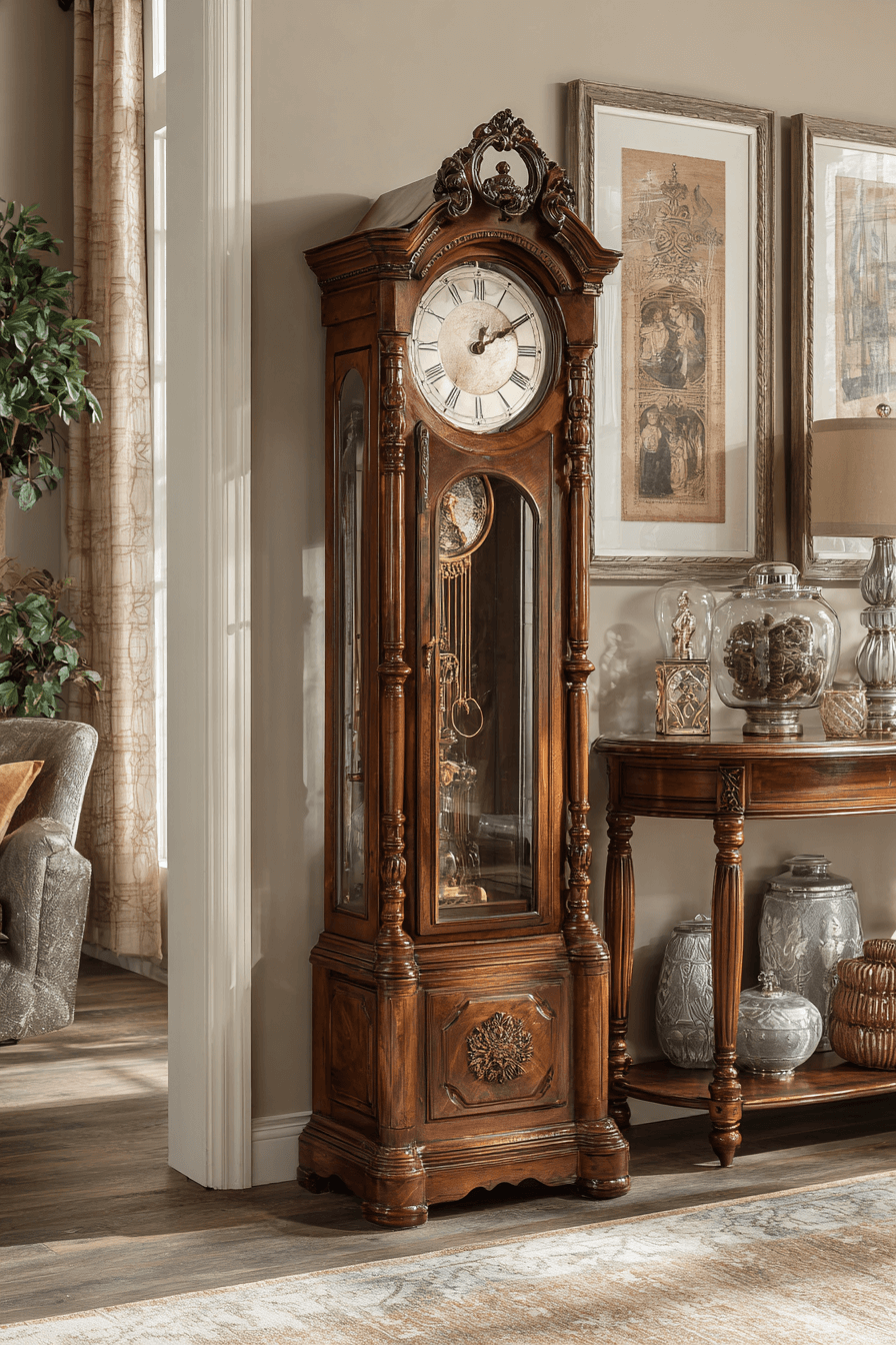 Entryways feel grounded when antique farmhouse decor includes a classic grandfather clock. Tall silhouettes and gentle chimes create a welcoming presence. Intricate woodwork and traditional dials reflect skilled craftsmanship. More than functional, these clocks serve as heirloom focal points. Their presence adds rhythm and grace to the home.