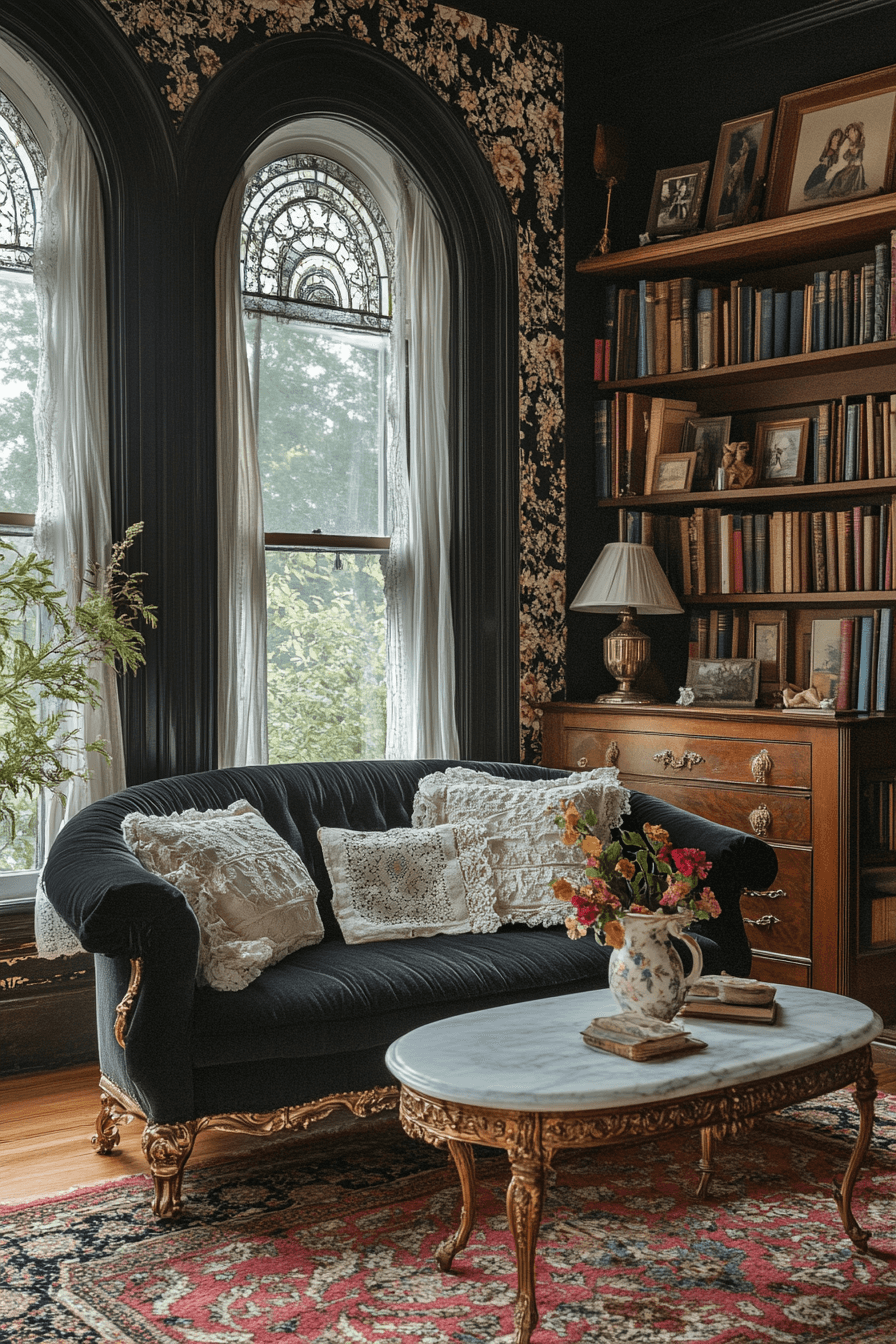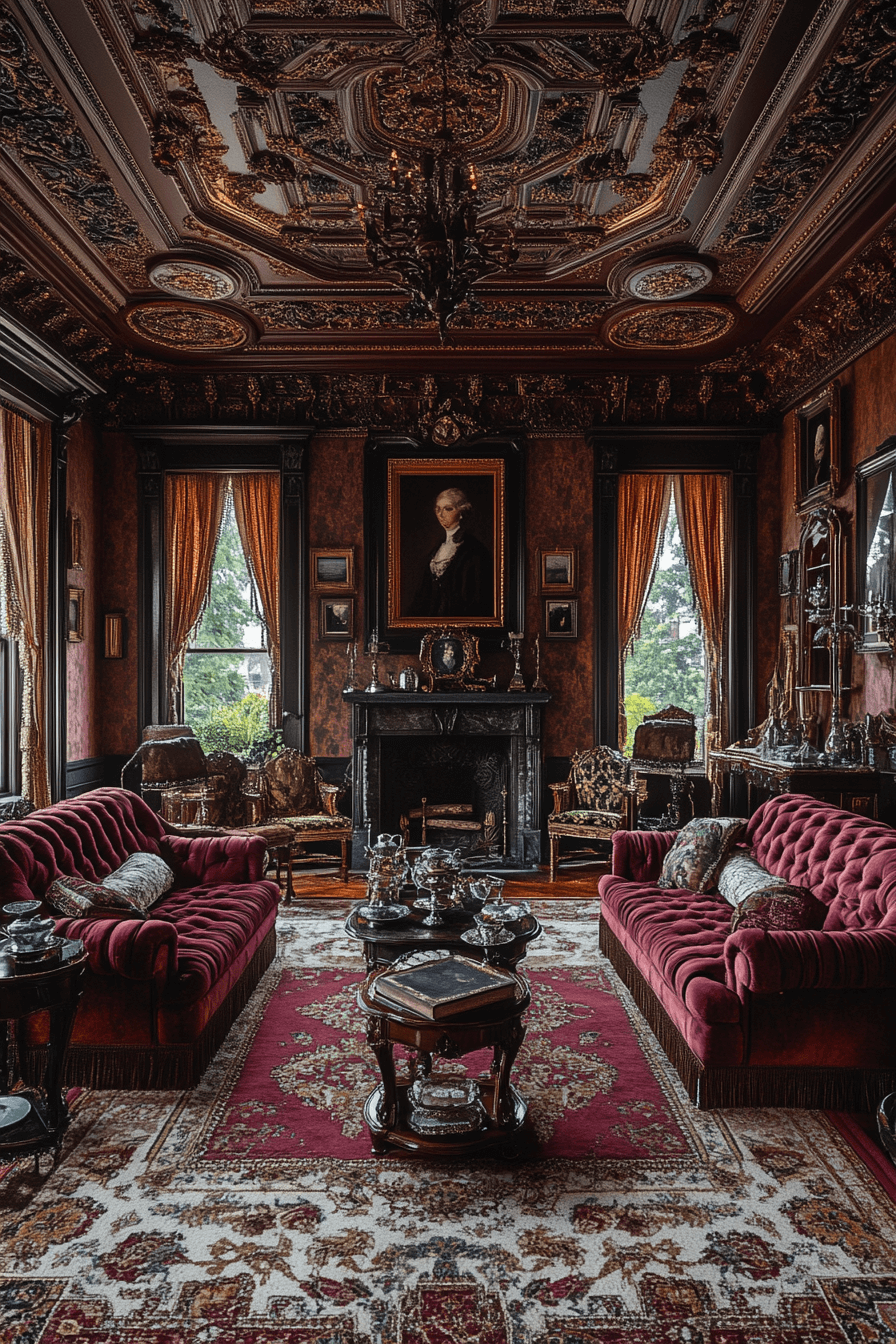 A Victorian-inspired sitting room celebrates layered richness within an antique interior. Tufted seating, heavy drapes, and patterned rugs create immersive elegance. Oil portraits and ornate mirrors enhance depth and storytelling. The space encourages long conversations and graceful gatherings. Its dramatic textures feel indulgent and nostalgic. Click to embrace Victorian splendor in your antique interior!