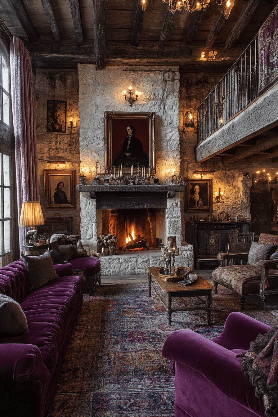 Rustic aristocratic styling merges countryside warmth with refined elegance in an antique interior. Exposed beams, stone fireplaces, and velvet upholstery coexist effortlessly. The interplay between rugged and polished textures creates inviting contrast. Antique dining tables and candelabras enhance depth. This style feels both grounded and regal. Click to bring rustic luxury into your antique interior!