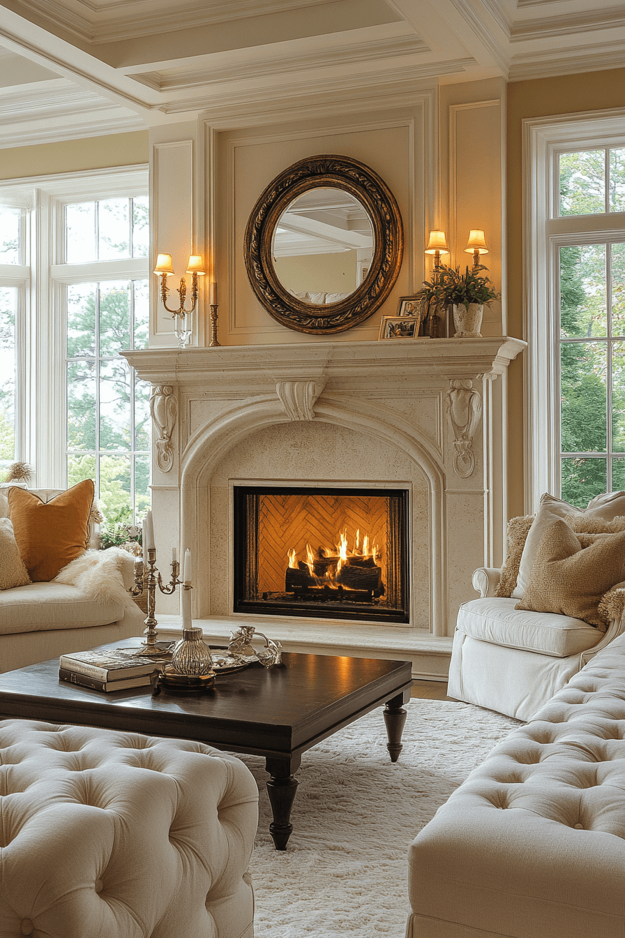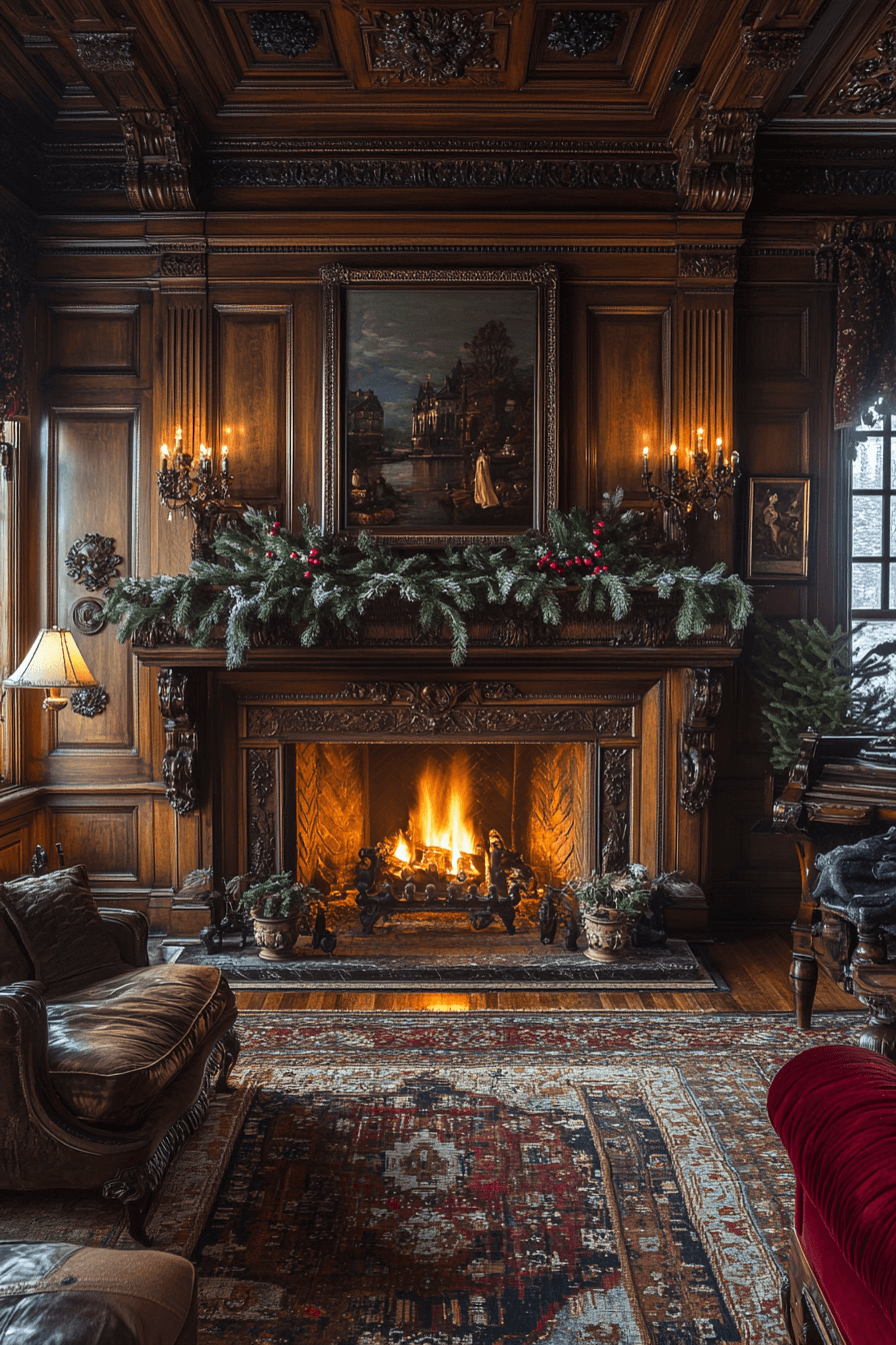 Carved mantel accents showcase artisan craftsmanship within an antique interior. Intricate scrollwork and floral carvings frame fireplaces like works of art. Layered with clocks and candelabras, they command refined attention. These details anchor formal living rooms beautifully. The sculptural presence elevates surrounding décor. Tap to highlight your antique interior with carved elegance!