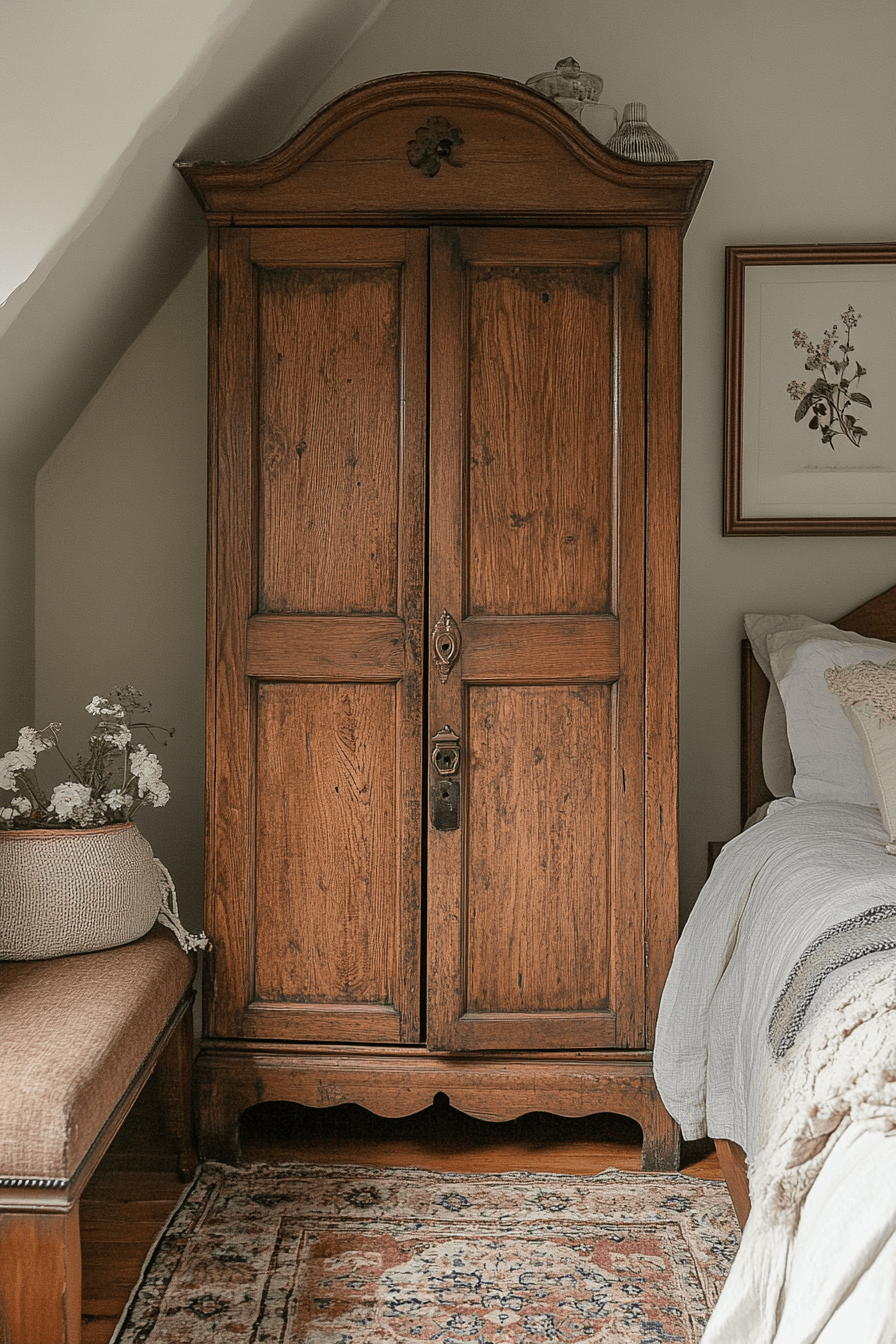 Repurposed armoires become statement storage pieces in an antique interior. Their towering forms and ornate hardware add architectural presence. Used creatively as wardrobes or cabinets, they blend beauty with function. The aged wood finish introduces texture and warmth. They make practical storage feel curated. Click to reinvent storage with antique interior sophistication!
