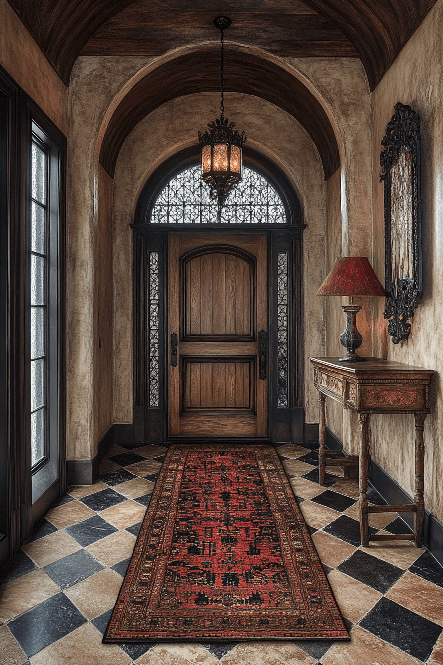 Old-world entryways establish immediate character in an antique interior. Stone flooring, iron lanterns, and carved consoles create layered depth. Patinaed finishes welcome guests with historic warmth. Aged mirrors and classic accents complete the vignette. The entry feels both functional and dramatic. Tap to make your antique interior unforgettable from the first step!