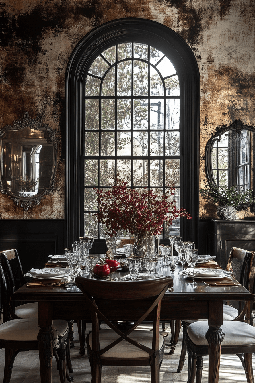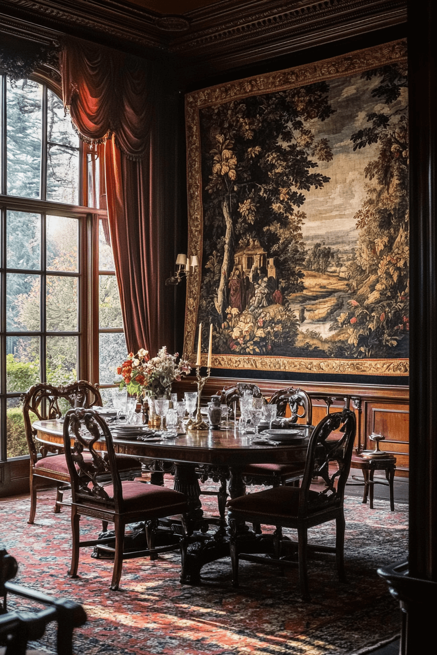 Baroque-inspired dining spaces bring dramatic artistry into an antique interior. Carved chairs, gilded mirrors, and jewel-toned fabrics create immersive richness. Layered lighting enhances the luxurious mood. Patterned rugs anchor the setting gracefully. Despite the opulence, balanced styling keeps it welcoming. Tap to dine in unforgettable antique interior elegance!