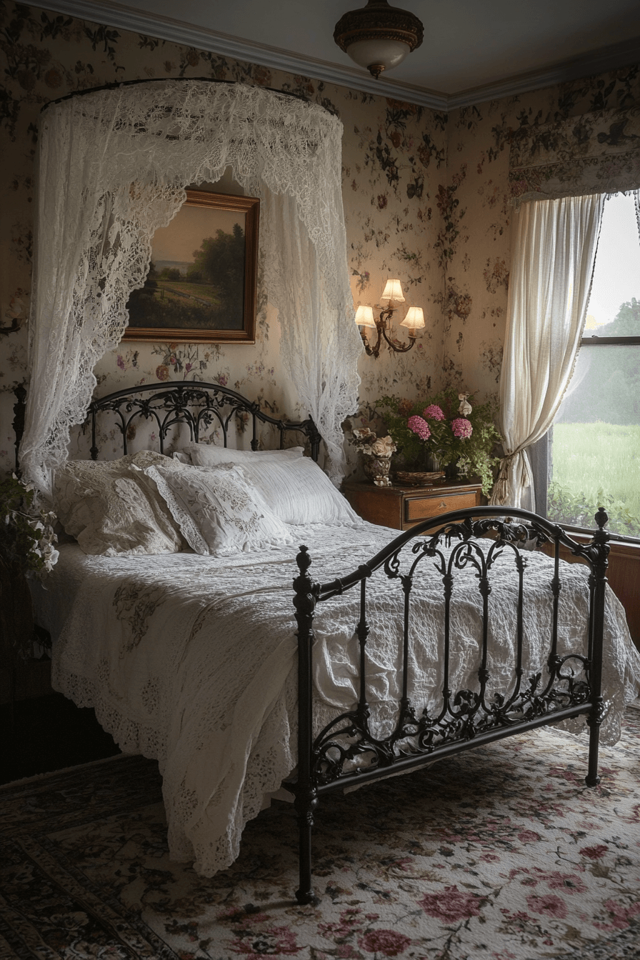 Iron bed frames introduce romantic structure into an antique interior bedroom. Curved metalwork contrasts beautifully against soft linens and lace. Paired with antique nightstands, the look feels cohesive and graceful. The durability adds both charm and practicality. Ornate scrollwork enhances visual interest subtly. Tap to design a dreamy antique interior retreat!
