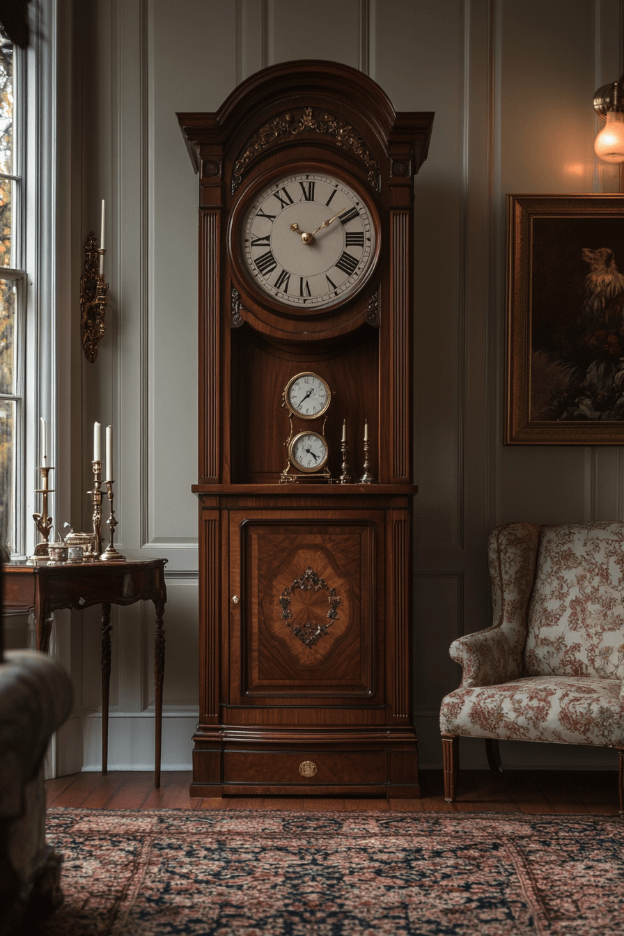Statement clocks anchor an antique interior with both function and heritage beauty. Whether tall floor clocks or ornate wall pieces, they command presence. Intricate carvings highlight craftsmanship. Their steady ticking adds subtle ambiance. They become timeless focal points in studies or living rooms. Click to let classic timepieces define your antique interior!