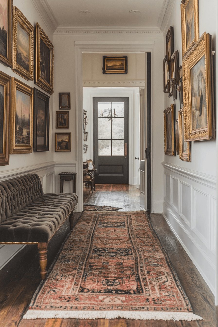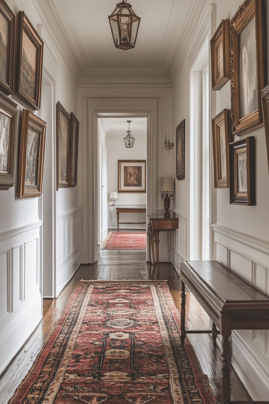 Hallway galleries transform transitional spaces into curated moments within an antique interior. Framed artwork lines walls with intentional rhythm. Runner rugs and sconces amplify historic ambiance. These corridors feel purposeful and layered. The art brings personality to every step. Tap to turn your antique interior hallway into a masterpiece!