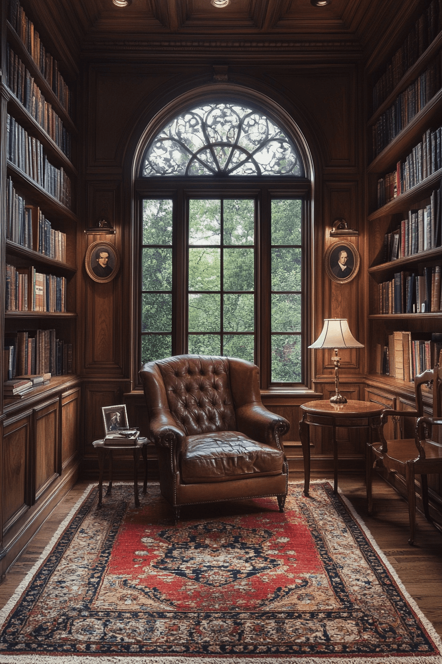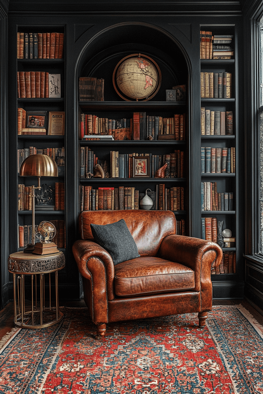 A leather-lined library nook creates depth and intimacy within an antique interior. A club chair, brass lamp, and dark shelving establish a rich, contemplative mood. The patina of worn leather enhances the sense of history and comfort. Persian rugs and globe accents complete the scholarly atmosphere. It becomes the perfect corner for quiet reflection. Tap to design your own antique interior reading retreat!