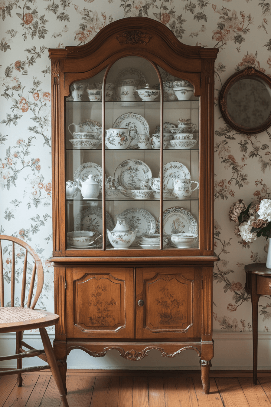 Glass-front display cabinets refine an antique interior while showcasing treasured collections. Carved wood frames and transparent panels create museum-like elegance. They beautifully house porcelain, heirloom ceramics, or vintage objects. Placed in dining rooms or entryways, they feel curated and intentional. The mix of display and craftsmanship adds polished charm. Click to find the perfect showcase piece for your antique interior!