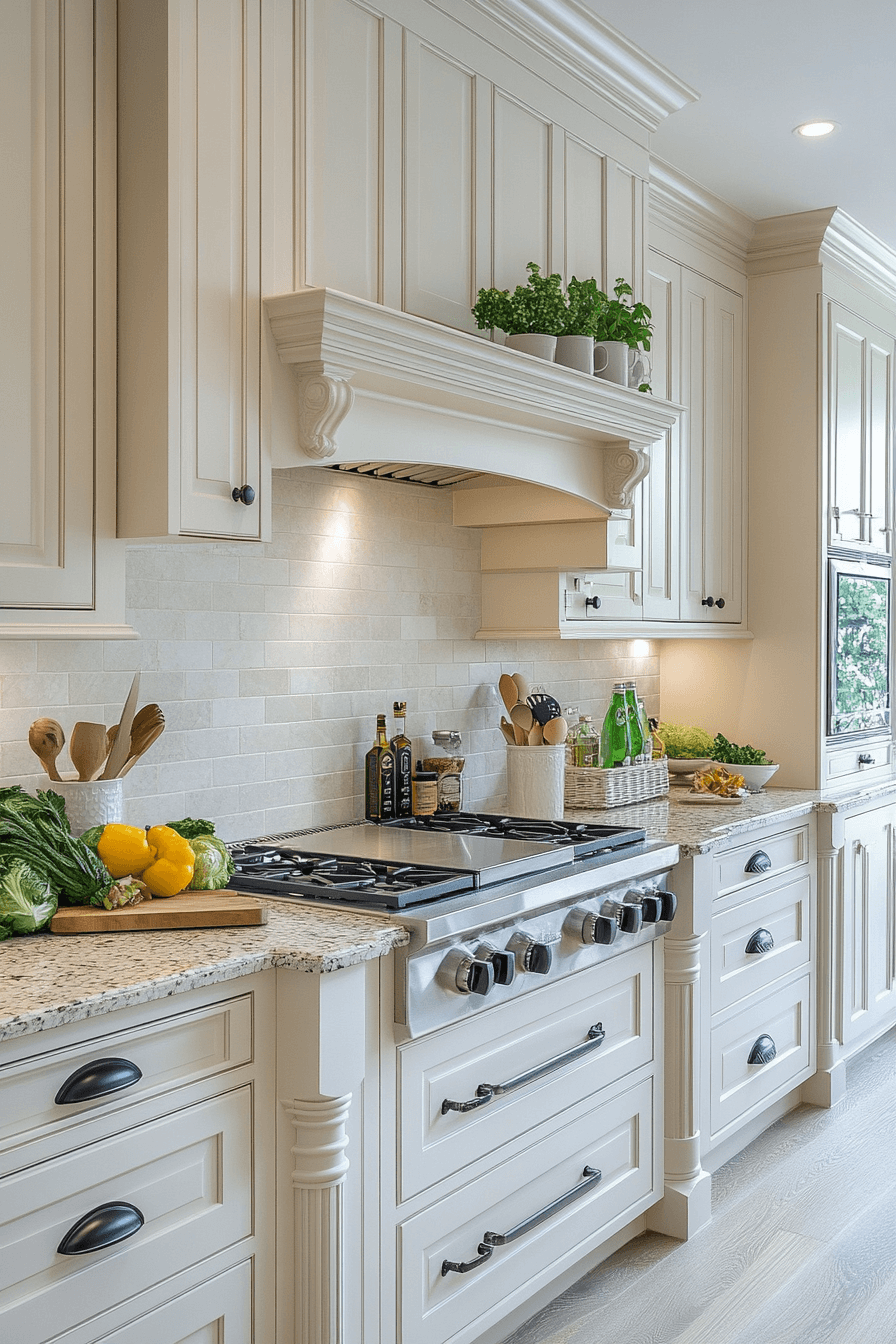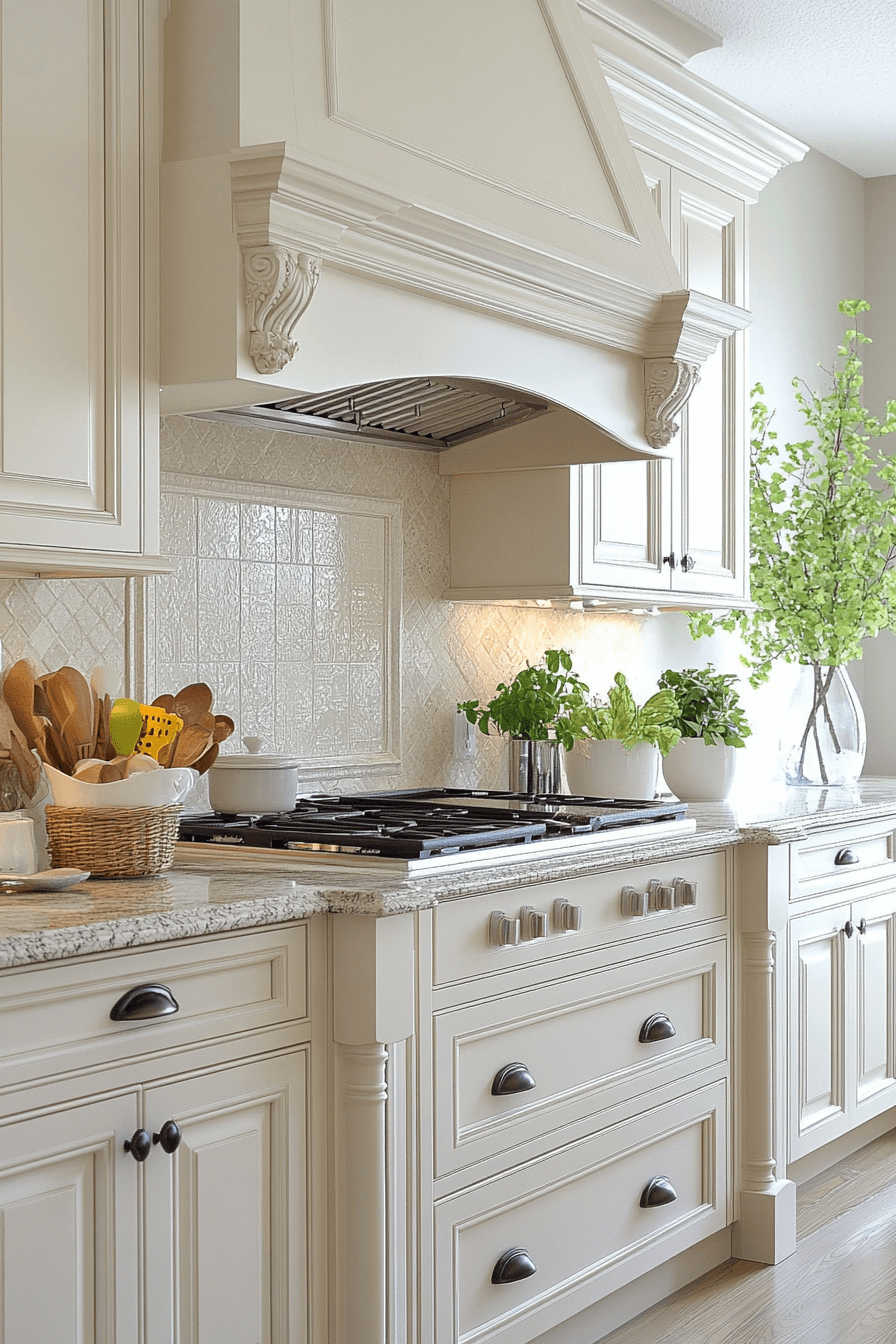 A soft, dreamy atmosphere forms when antique white kitchen cabinets guide the aesthetic. Their light appearance lends an almost ethereal quality to the space. Antique details ground the look with warmth. Together, the elements create gentle visual interest. This kitchen feels memorable and welcoming.