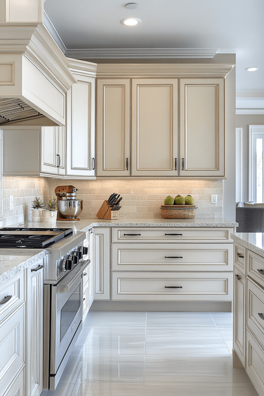Subtle glow and everyday comfort come together beautifully with antique white kitchen cabinets incorporated into the design. Their softly reflective surfaces help brighten the room without creating harsh contrast. Kitchens with limited natural light especially benefit from this warm luminosity. The antique finish introduces character that feels intentional and inviting. This balance keeps the space cozy and functional.