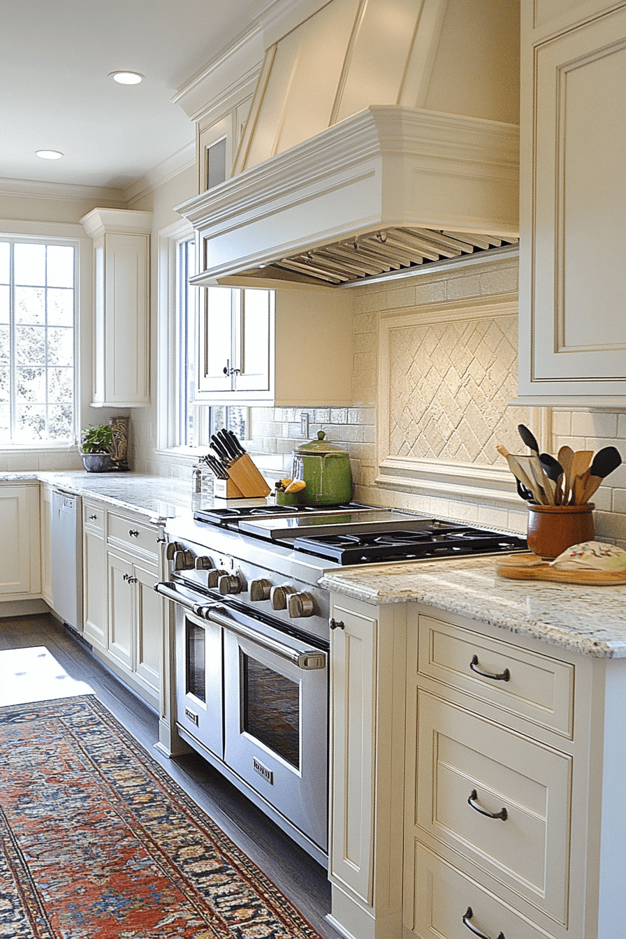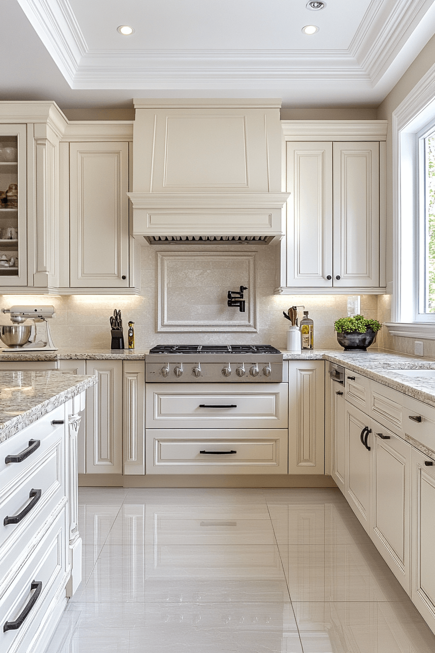 Energy and refinement coexist beautifully with antique white kitchen cabinets enhancing the overall atmosphere. Their luminous finish keeps the space lively without overwhelming the senses. Antique detailing adds charm that softens the brightness. The kitchen feels cheerful, polished, and versatile. It’s a look that supports both everyday life and entertaining.