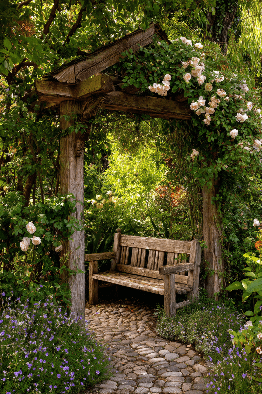 Natural gateways feel more enchanting when antique yard decor ideas include aged wooden arbors. Climbing florals create living tunnels filled with scent and beauty. A simple bench beneath transforms the structure into a peaceful pause point. Weathered wood adds texture and authenticity. These arbors frame experiences, not just paths.