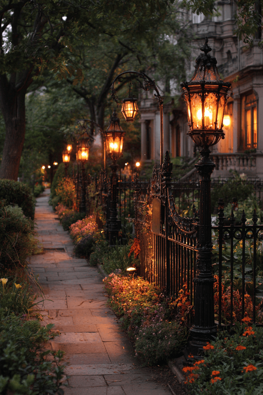 Evenings glow beautifully when antique yard decor ideas include Gilded Age–inspired outdoor lighting. Decorative lanterns and sconces cast soft illumination across paths and gathering areas. Intricate detailing enhances historical ambiance. Light becomes part of the experience rather than just a utility. Nights feel magical and welcoming.