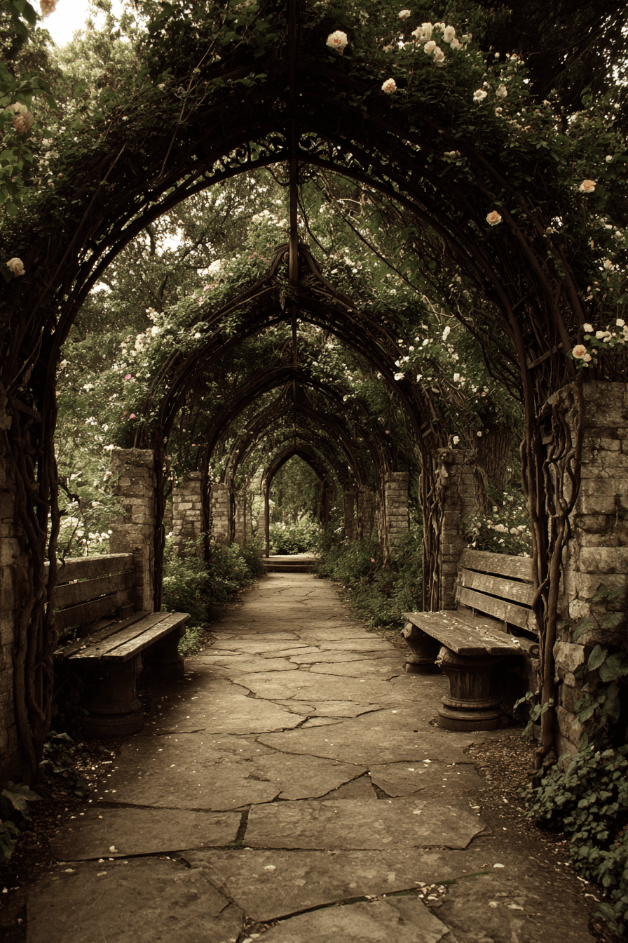 Dramatic silhouettes enhance landscapes when antique yard decor ideas include Gothic-inspired arches. Pointed forms and scrollwork introduce vertical interest. Ivy and climbing plants soften their bold lines. Paired stone accents deepen the medieval mood. The garden feels mysterious and poetic.