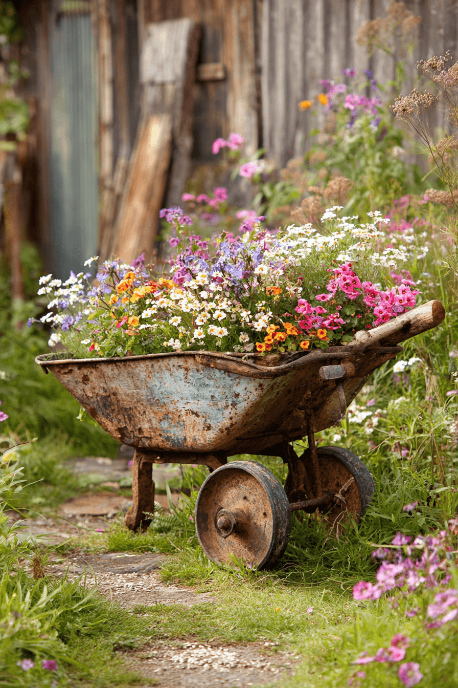 Creative reuse shines in antique yard decor ideas that transform vintage wheelbarrows into planters. Weathered textures add charm and movement. Cascading blooms soften industrial forms. These playful elements add personality to any garden. History becomes art through imagination.