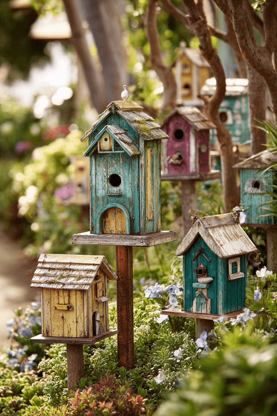 Gentle charm spreads throughout gardens styled with antique yard decor ideas featuring cottage birdhouses. Decorative architecture attracts birds while adding visual delight. Thoughtful placement encourages wildlife visits. Seasonal charm evolves naturally. These accents feel both sweet and functional.
