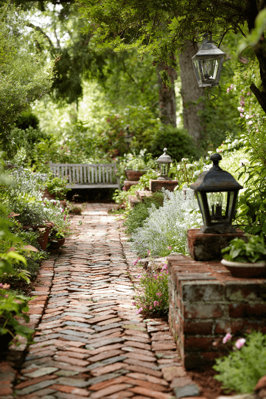 Character-rich walkways come alive through antique yard decor ideas using salvaged brick paths. Irregular textures tell stories beneath your feet. Curved layouts feel organic and inviting. Paired lanterns enhance nighttime appeal. Every step feels intentional.
