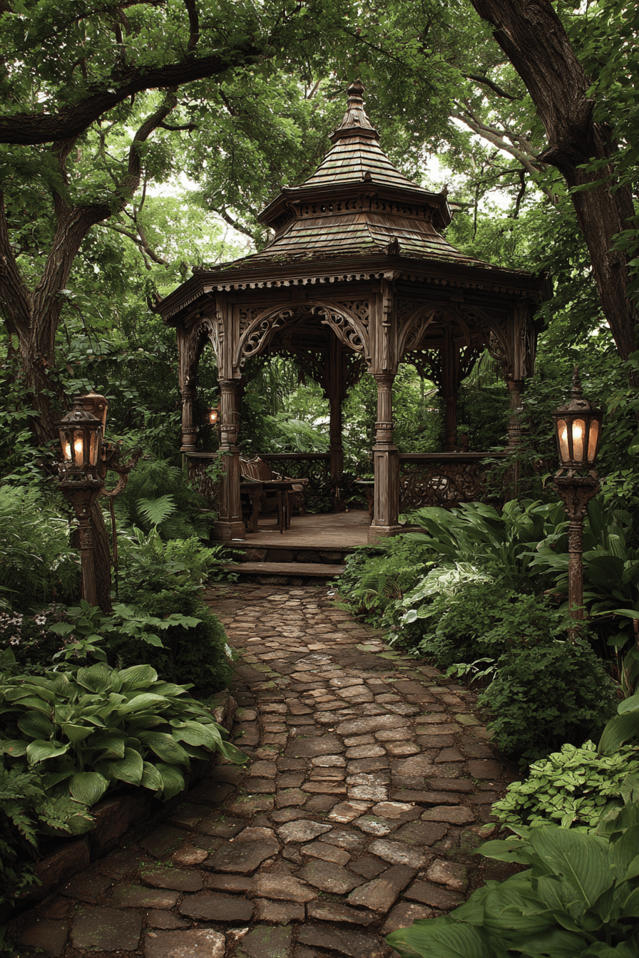 Romantic outdoor living becomes possible when antique yard decor ideas include old-world gazebo designs as statement features. Gracefully detailed iron or carved wooden structures add both function and visual drama. Climbing vines soften architectural lines while creating a lush canopy. Vintage furnishings beneath the structure invite lingering moments of rest. These gazebos transform gardens into destinations.