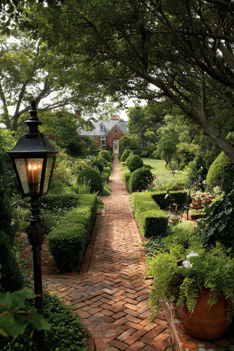 Formal pathways bring order and heritage to outdoor spaces shaped by antique yard decor ideas rooted in Colonial tradition. Brick or stone walkways guide movement while reinforcing symmetry. Vintage lighting adds warmth and evening appeal. Structured hedges and greenery frame each step with intention. These paths invite exploration while honoring classic design principles.