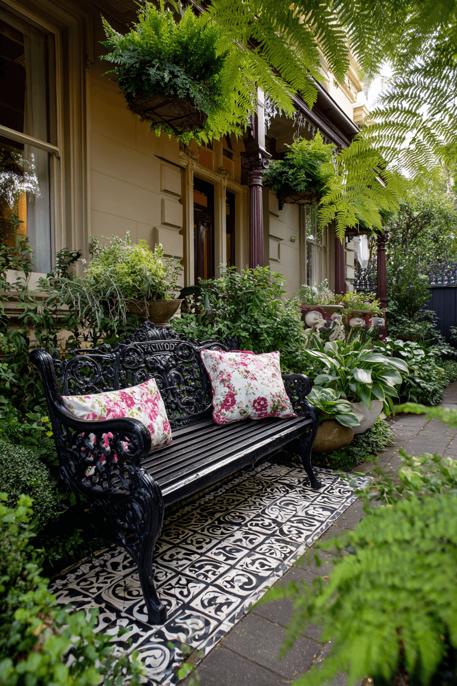 Lush greenery and refined seating define gardens influenced by antique yard decor ideas from the Edwardian era. Layered plantings, woven furniture, and decorative tables create terrace-style elegance. Mosaic surfaces and floral cushions enhance visual richness. The overall mood feels graceful yet inviting. Every element supports comfort and beauty.