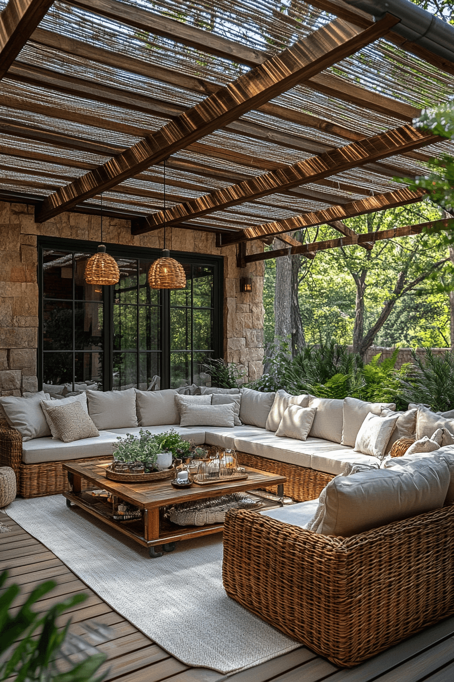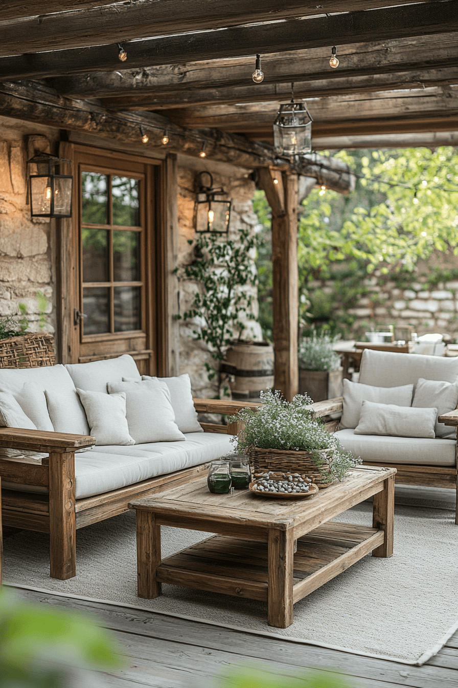 Rustic patio styling enriches backyard decor with natural textures and warm, lived-in charm that feels inviting and authentic. Weathered wood furniture and earthy tones create a grounded, welcoming vibe. Soft cushions and throws balance the rugged elements with comfort. Simple decor pieces enhance character without overwhelming the design. Warm lighting adds a cozy glow during evening hours. Everything feels relaxed and full of personality. Bring timeless rustic charm to your outdoor space now!