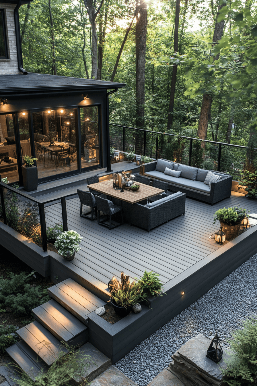 Contemporary deck design refreshes backyard decor with sleek finishes and practical layouts that feel modern and highly functional. Composite materials and streamlined furniture create a cohesive foundation. Neutral tones keep the palette balanced and visually appealing. Defined zones for lounging and dining enhance flow and usability. Subtle lighting highlights the clean aesthetic without clutter. The design blends durability with style effortlessly. Upgrade your outdoor space with this polished look today!