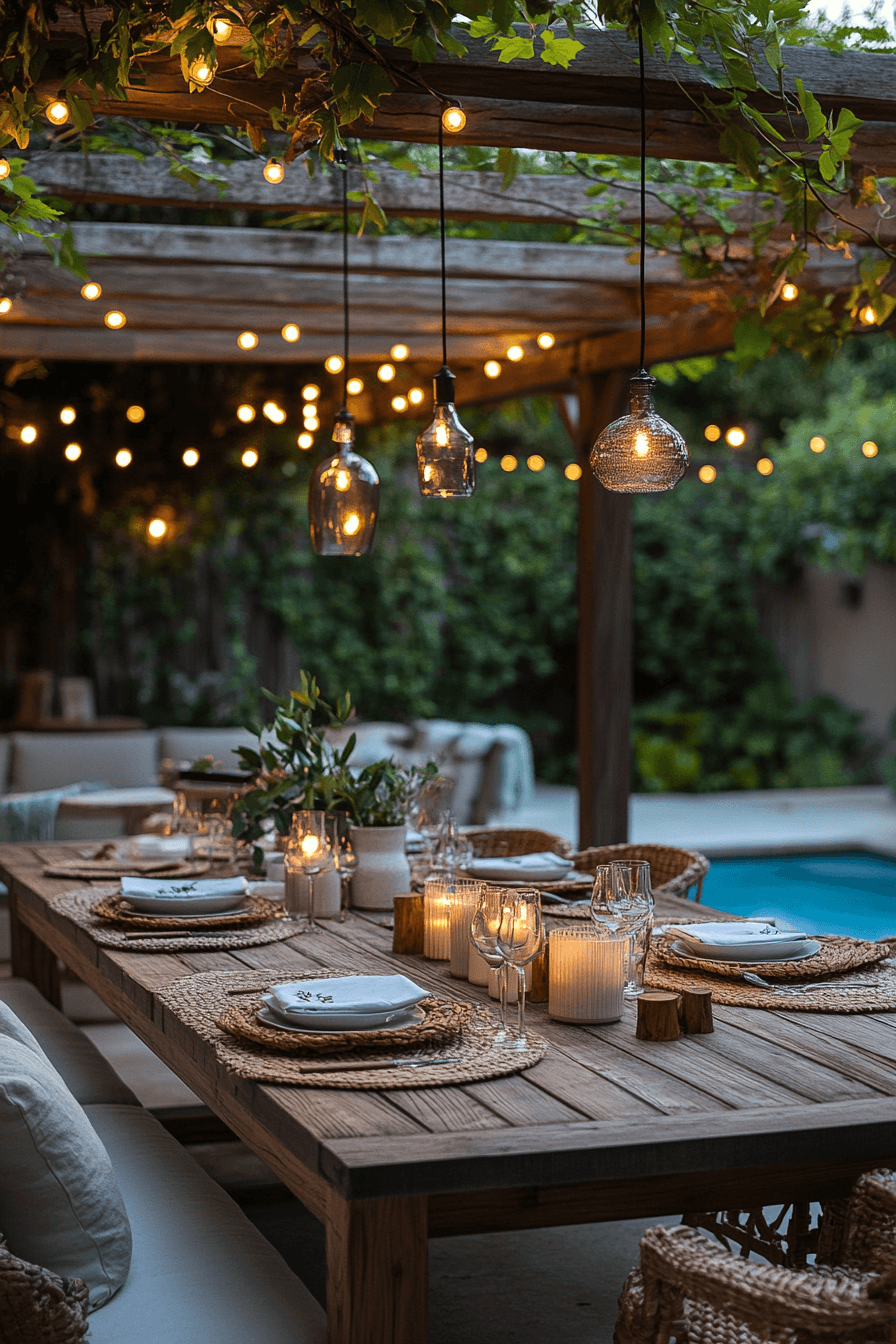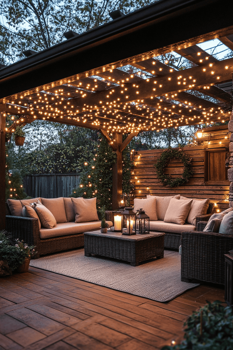 String light styling transforms backyard decor into a glowing, magical retreat filled with warmth and charm. Soft lights draped overhead create a cozy canopy effect that enhances the entire space. Simple furniture allows the lighting to shine as the main feature. Natural textures complement the warm glow beautifully. Additional accents like candles enhance the dreamy atmosphere. The result feels intimate, inviting, and effortlessly stylish. Create your own glowing outdoor escape tonight!