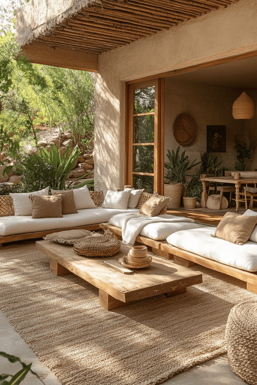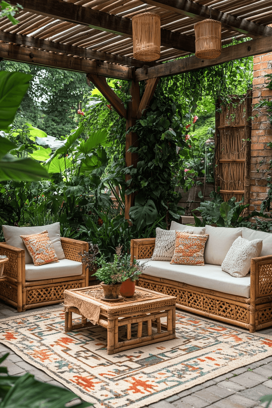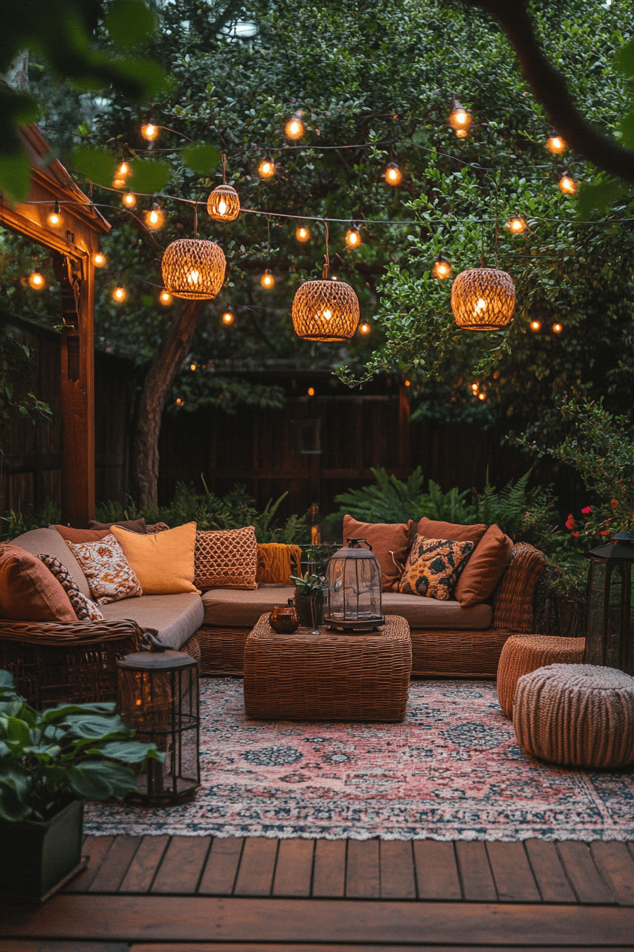 Boho-inspired styling fills backyard decor with personality through layered fabrics, natural textures, and warm earthy tones that feel relaxed and expressive. Wicker seating paired with patterned rugs and soft cushions creates a curated yet carefree atmosphere. Macrame accents and wood finishes add depth and visual interest throughout. Soft lighting from lanterns or string lights enhances the cozy mood in the evenings. A playful mix of colors keeps the design lively without overwhelming the space. Everything feels creative, inviting, and full of charm. Bring this free-spirited vibe into your outdoor space today!