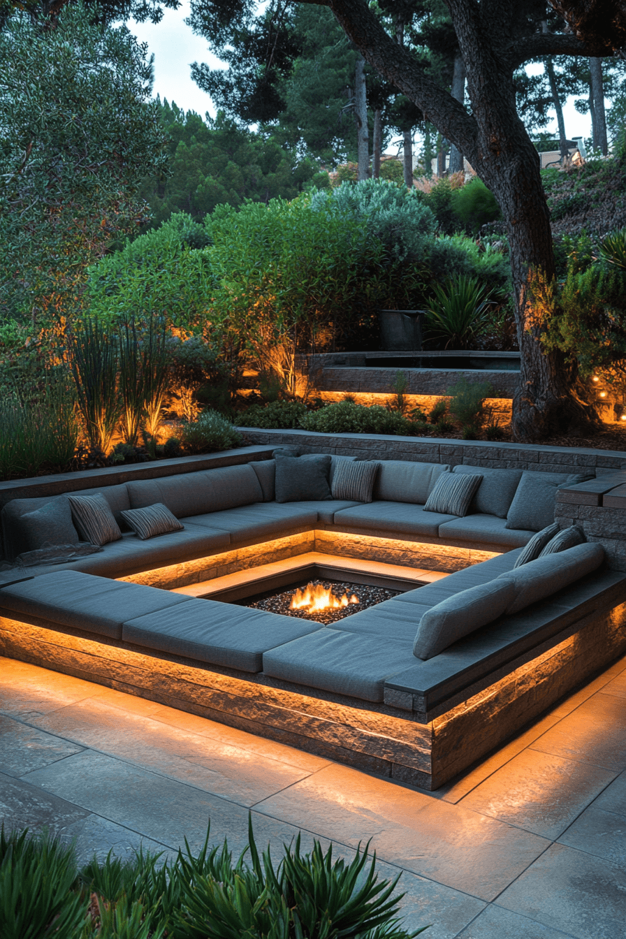 Sunken seating design adds depth to backyard decor with a cozy, built-in layout that feels intimate and modern. Lowered seating creates a natural gathering area. Soft cushions balance comfort with structure. Surrounding elements enhance the layered visual effect. Lighting adds warmth and highlights the design. The space feels unique, stylish, and inviting. Elevate your outdoor layout with this standout feature!