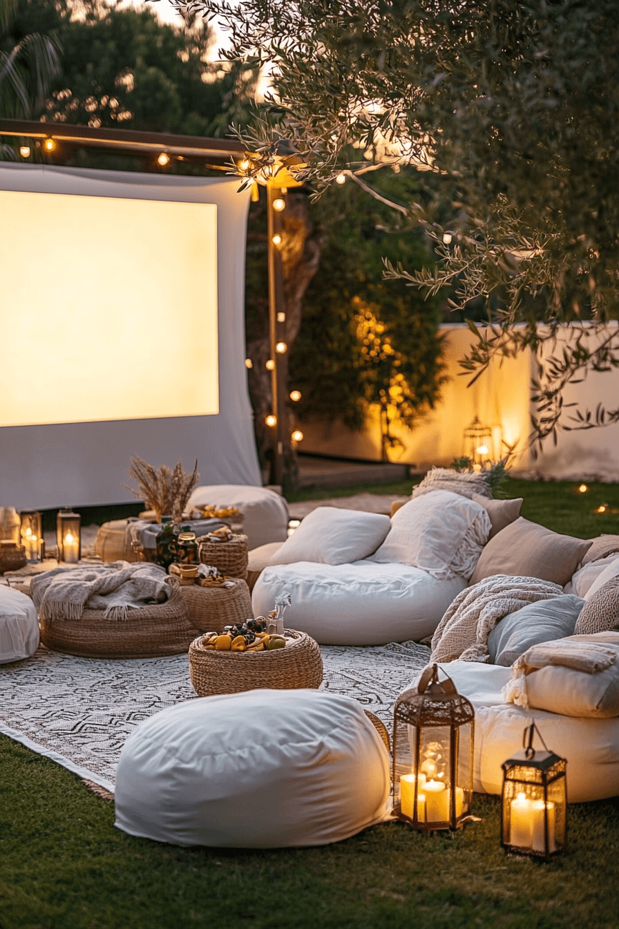 Backyard movie styling transforms backyard decor into a fun and cozy entertainment space perfect for memorable nights. Comfortable seating invites everyone to relax and enjoy the experience. A simple screen becomes the focal point enhanced by soft lighting. Blankets and cushions add extra comfort. Subtle lighting keeps the ambiance just right. Everything feels inviting and enjoyable. Create unforgettable movie nights outdoors now!