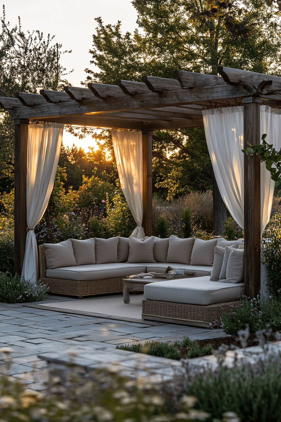 Pergola lounge design upgrades backyard decor with elegant structure and shaded comfort that defines the space beautifully. Clean architectural lines create the feeling of an outdoor room while offering relief from the sun. Draped fabrics or climbing greenery soften the structure with visual interest. Plush seating enhances comfort while maintaining a modern aesthetic. Layered lighting underneath adds warmth and ambiance in the evening. The balance of form and relaxation feels effortless. Elevate your outdoor living with this stylish upgrade!