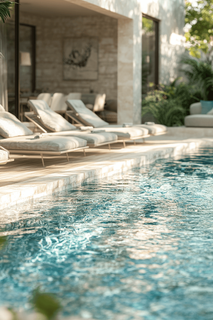 Poolside styling enhances backyard decor with resort-inspired elements that feel luxurious, open, and refreshing. Sleek loungers, clean lines, and refined materials create a polished atmosphere. Light-toned decking and glass accents reflect natural light beautifully. Plush cushions keep comfort at the forefront without cluttering the space. Subtle landscaping complements the modern aesthetic. The overall feel is airy, indulgent, and relaxing. Turn your outdoor space into a private getaway today!