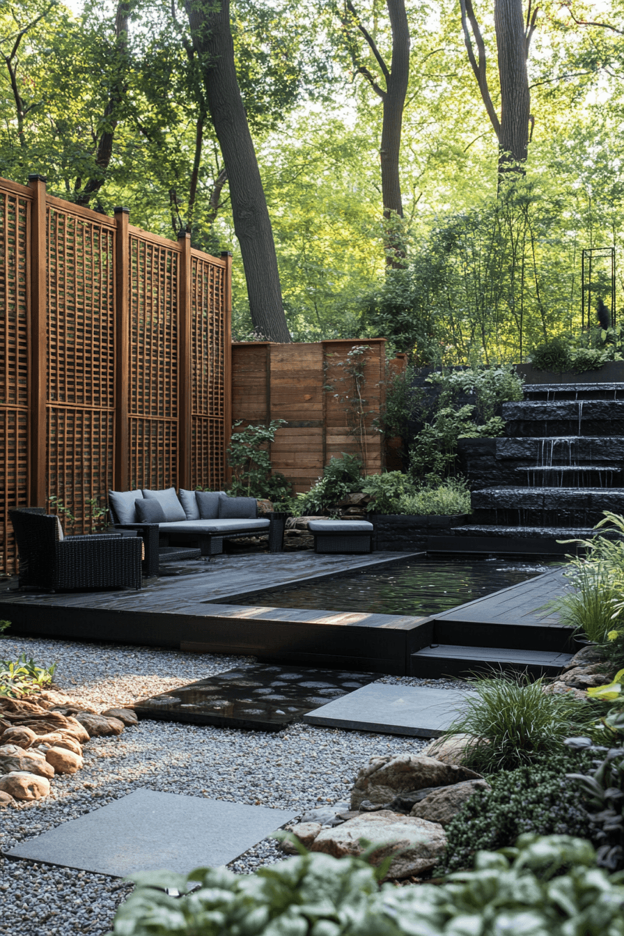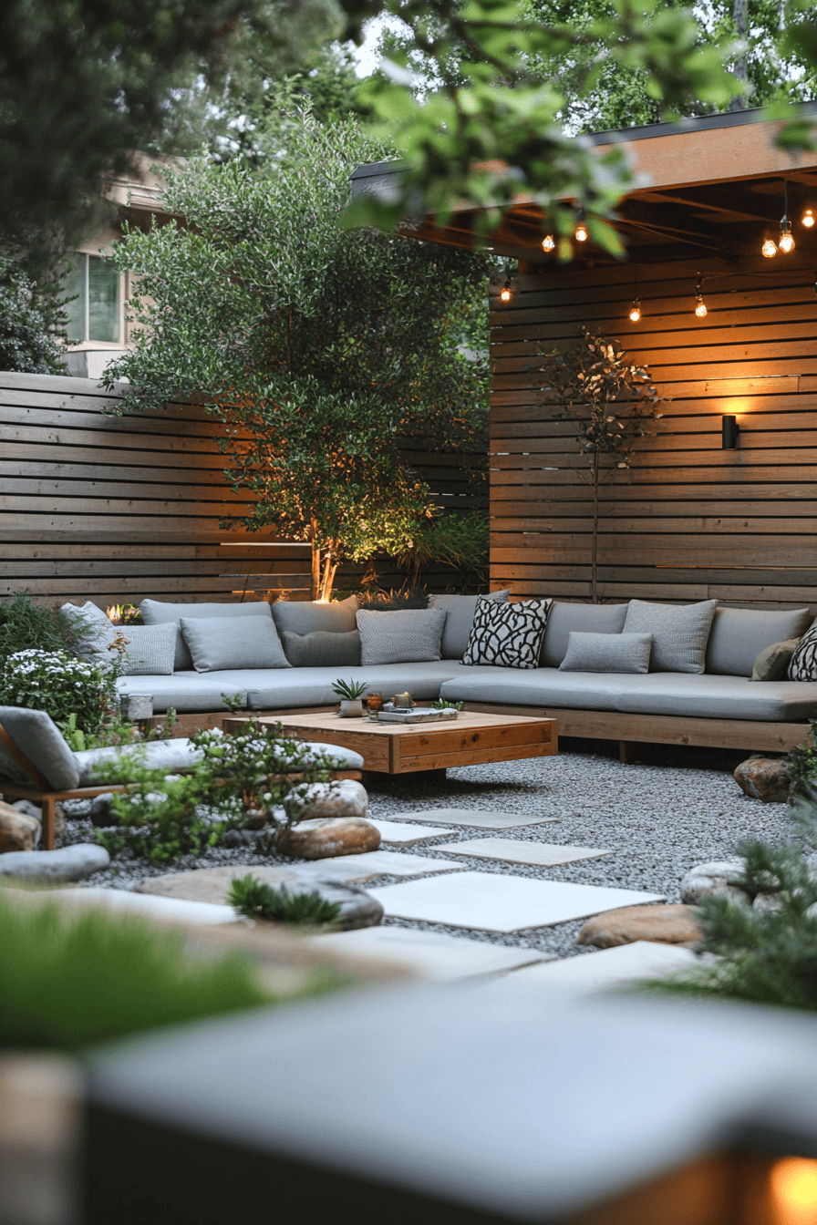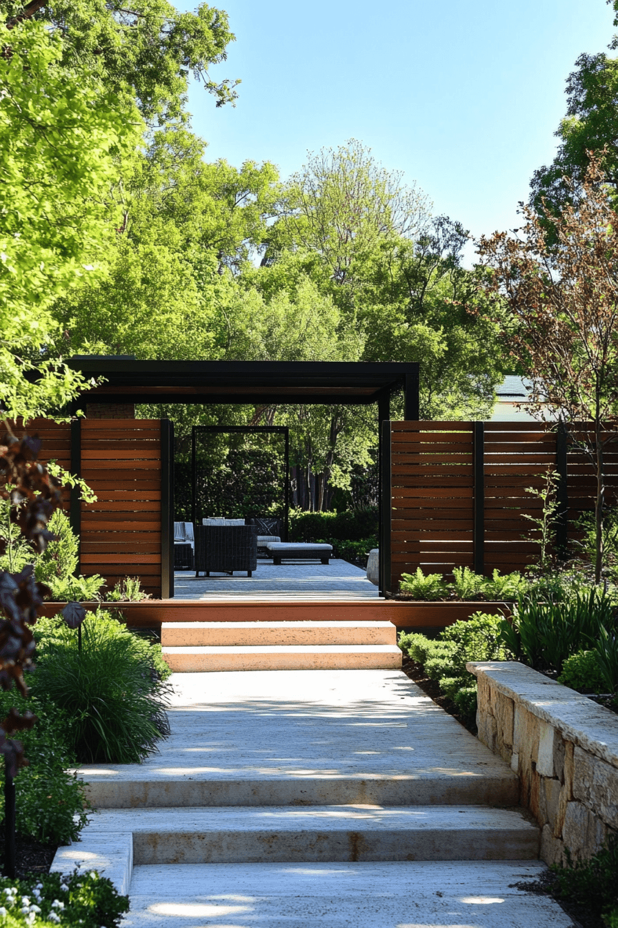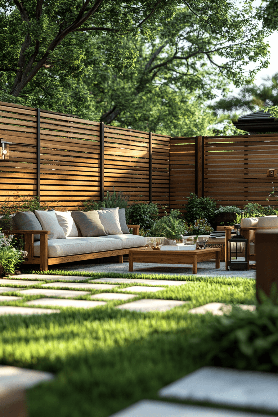 Modern privacy screens refine backyard fence ideas with sleek panels that offer seclusion without closing off the space. Geometric patterns or slatted designs allow light and airflow to pass through. Durable materials maintain a clean and polished finish. Subtle detailing adds interest while keeping the look minimal. The space feels enclosed yet breathable. Perfect for relaxing or entertaining. Create your own private outdoor escape today!