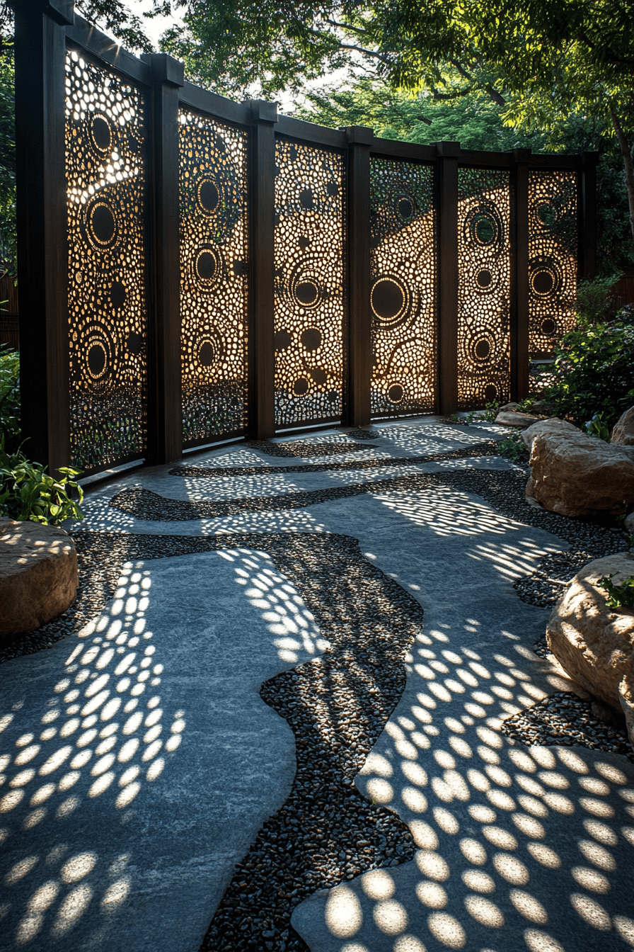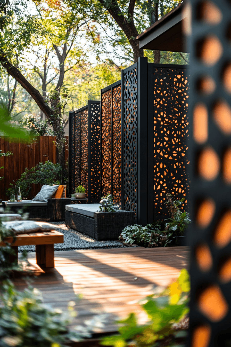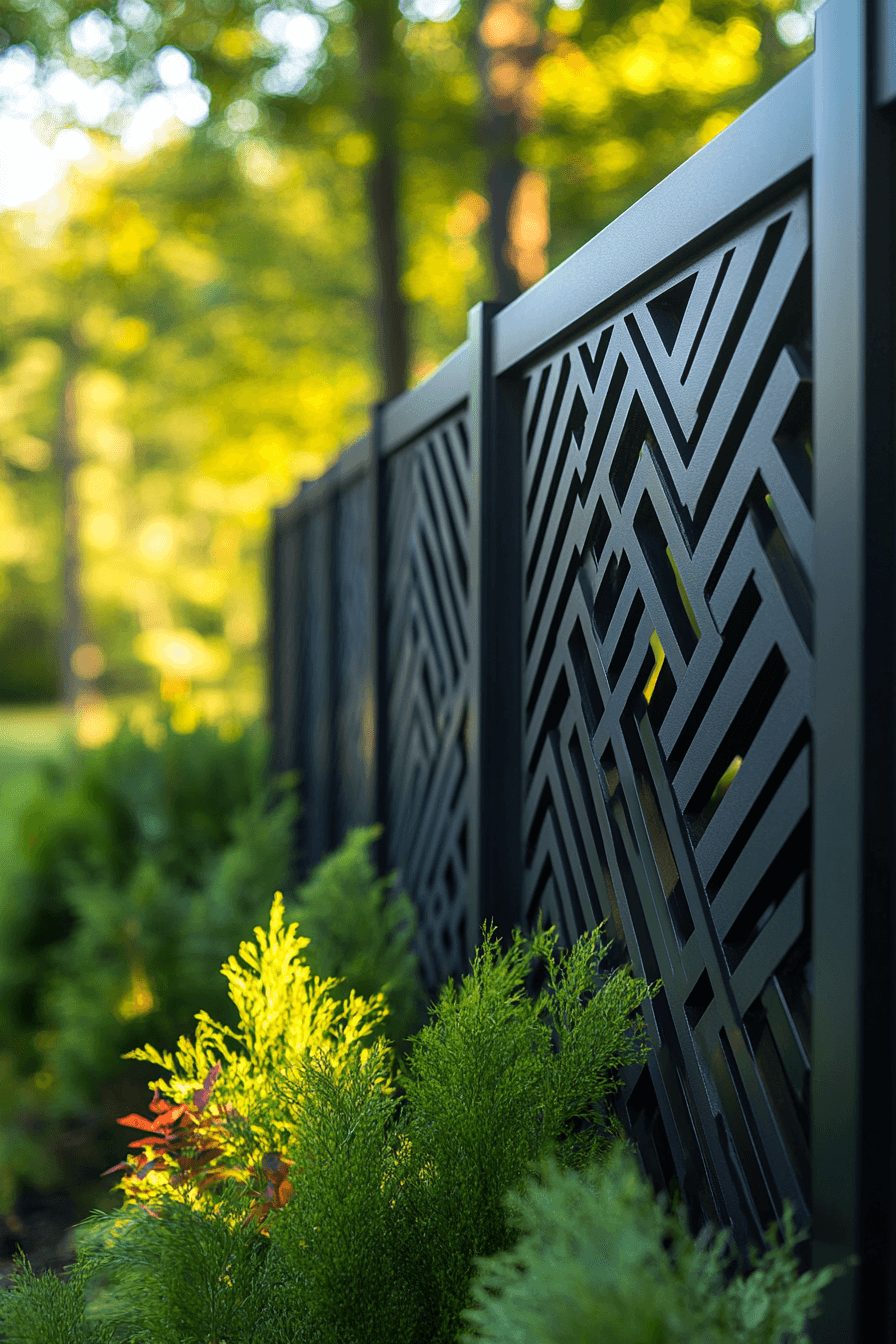 Laser-cut metal fencing transforms backyard fence ideas into artistic focal points with intricate patterns and dynamic shadows. Cut-out designs create movement as light shifts throughout the day. Sleek metal finishes maintain a modern edge. Privacy remains while still feeling decorative. The fence becomes both structure and statement. The result feels bold and unique. Add artistic flair to your backyard today!
