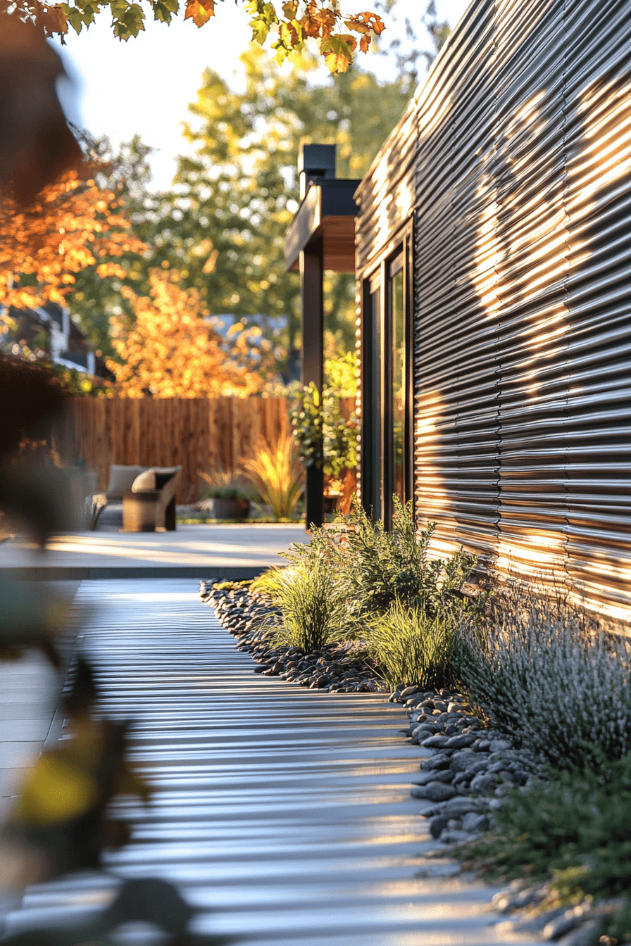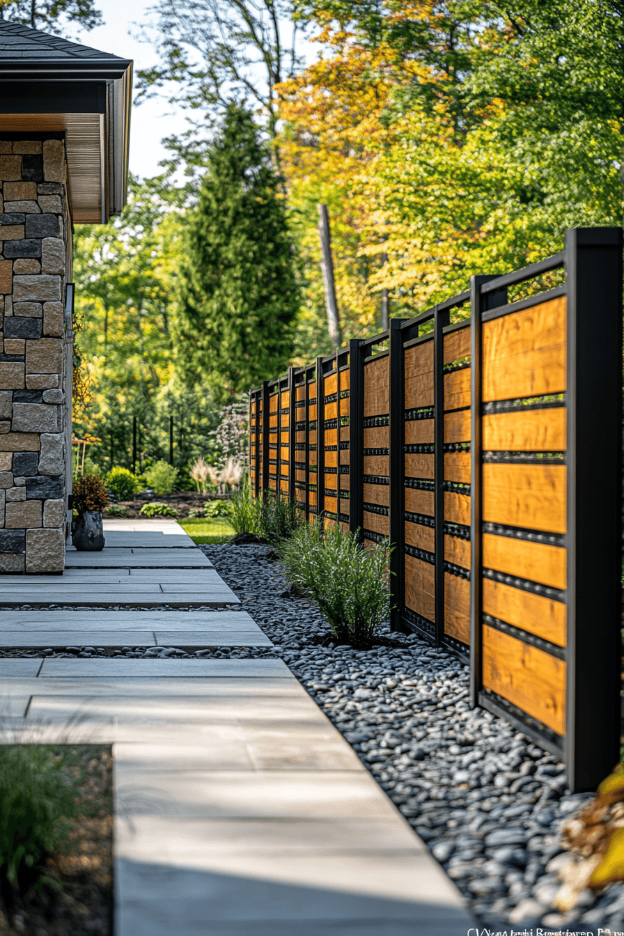 Corrugated metal fencing energizes backyard fence ideas with industrial texture and reflective surfaces. Ribbed patterns create visual rhythm. Light shifts across the surface throughout the day. Paired with wood, it feels more balanced. Durable and low-maintenance for long-term use. The design feels edgy yet refined. Bring industrial style to your backyard today!