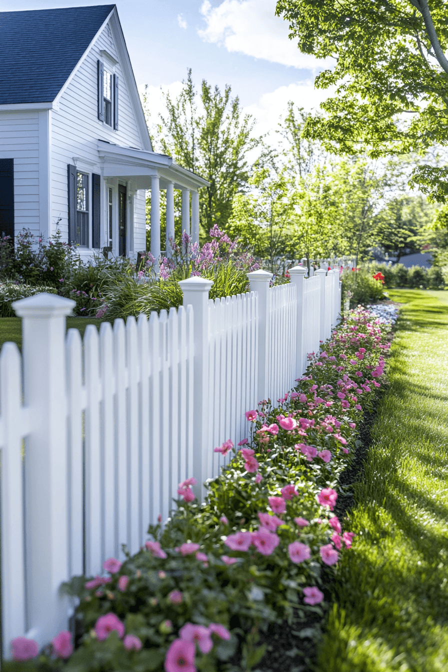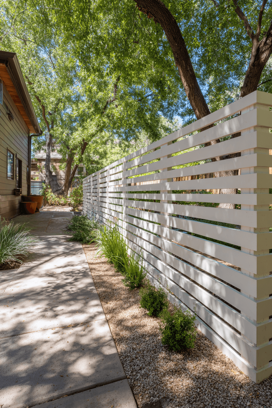 Modern picket fencing updates backyard fence ideas with a clean and simplified version of a classic style. Crisp white finishes brighten the entire yard. Streamlined shapes keep the look contemporary. The design adds charm without feeling outdated. Works beautifully with various home styles. The result feels fresh and welcoming. Refresh your yard with this modern classic today!