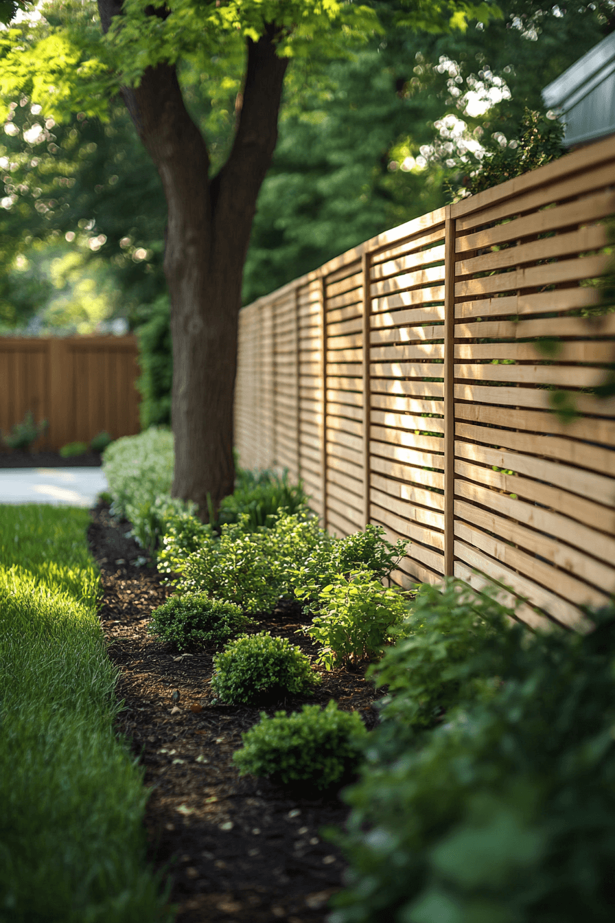 Horizontal slat fencing elevates backyard fence ideas with sleek lines that create a wide, open visual flow across the yard. Long boards stretch the space visually, making even compact areas feel more expansive. Warm wood tones like cedar or walnut add natural richness while keeping a modern edge. Subtle spacing between slats allows light to filter through beautifully. This balance creates privacy without heaviness. The overall look feels polished, calm, and design-forward. Transform your outdoor space with this modern favorite today!