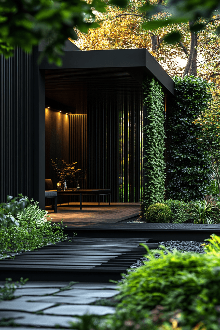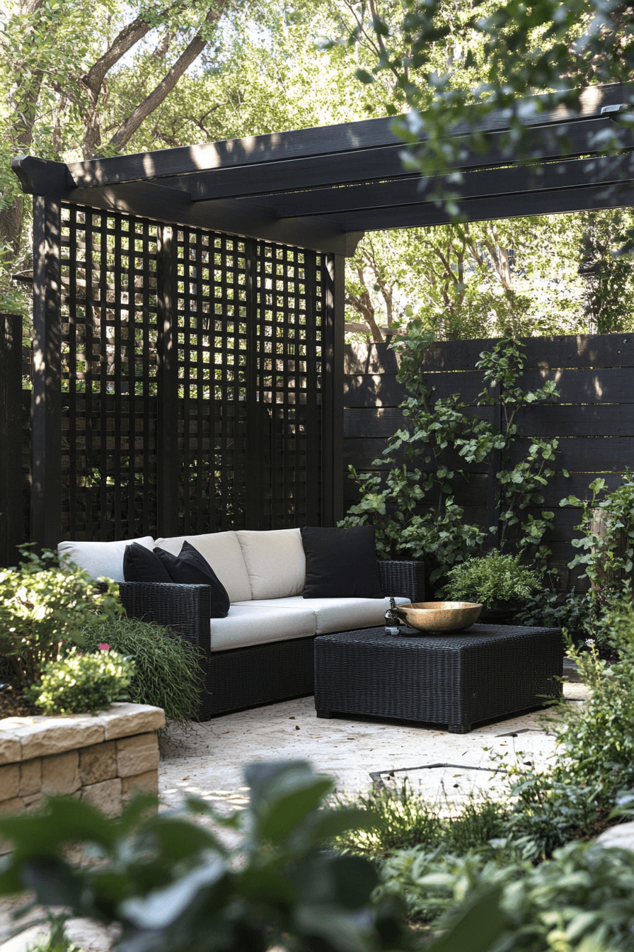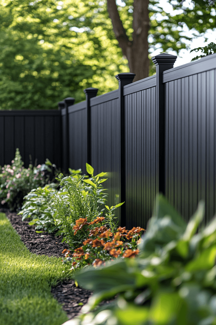 Black metal panel fencing transforms backyard fence ideas with bold contrast that instantly highlights greenery and outdoor decor. Dark finishes create a dramatic backdrop while maintaining a sleek, minimal profile. Slim framing keeps the design visually light yet durable. Clean lines add a modern architectural feel. Sunlight reflects subtly across the surface, enhancing depth. The space feels sophisticated and high-end. Bring striking contrast into your yard today!