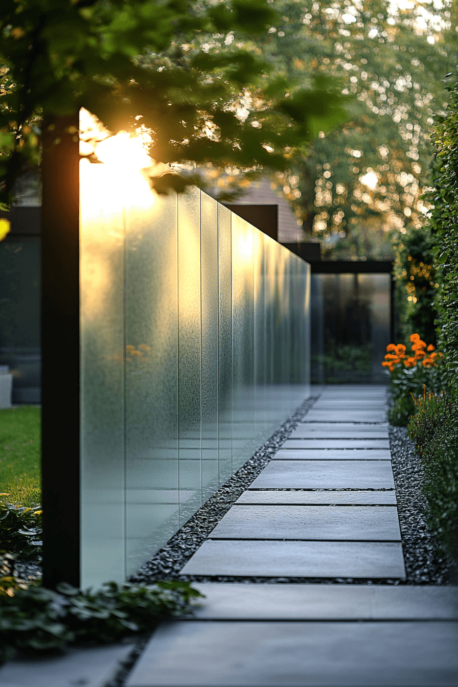 Frosted glass fencing enhances backyard fence ideas with soft privacy and elegant light diffusion. Translucent panels allow brightness while obscuring views. Clean frames maintain a modern look. Light glows gently through the material. Perfect for upscale outdoor settings. The space feels calm and refined. Discover this sleek privacy option today!
