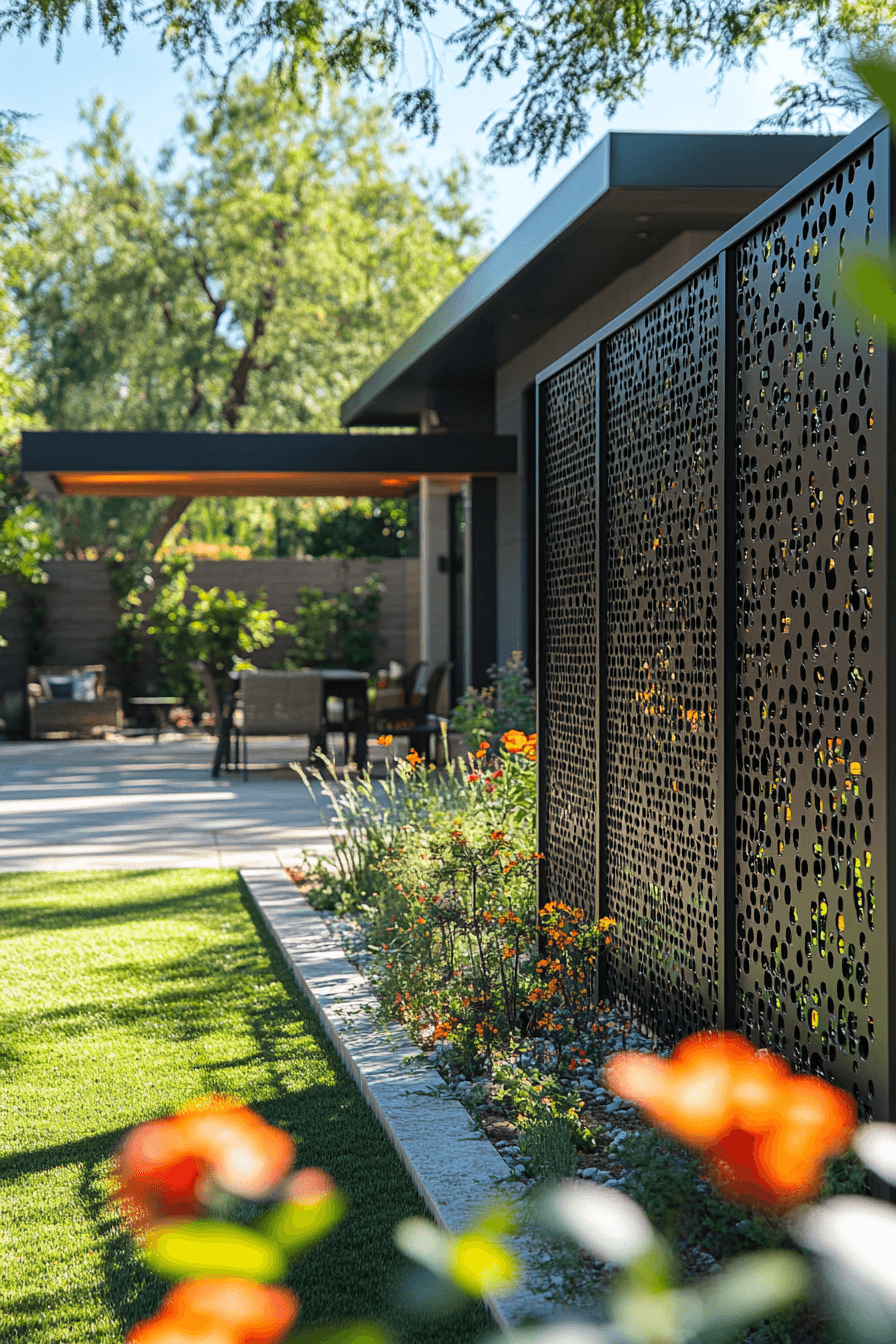 Perforated metal fencing upgrades backyard fence ideas with subtle texture and airflow through small openings. Light passes through to create shifting patterns. Metal finishes keep the look modern. Privacy remains while adding visual interest. The design feels unique and dynamic. Everything stays sleek and functional. Explore this modern texture today!
