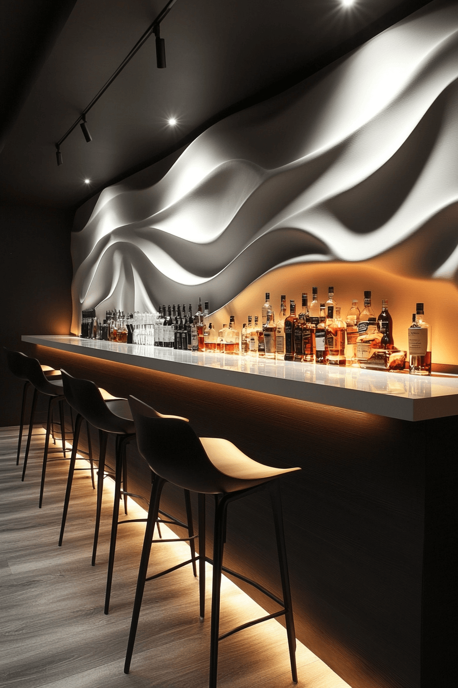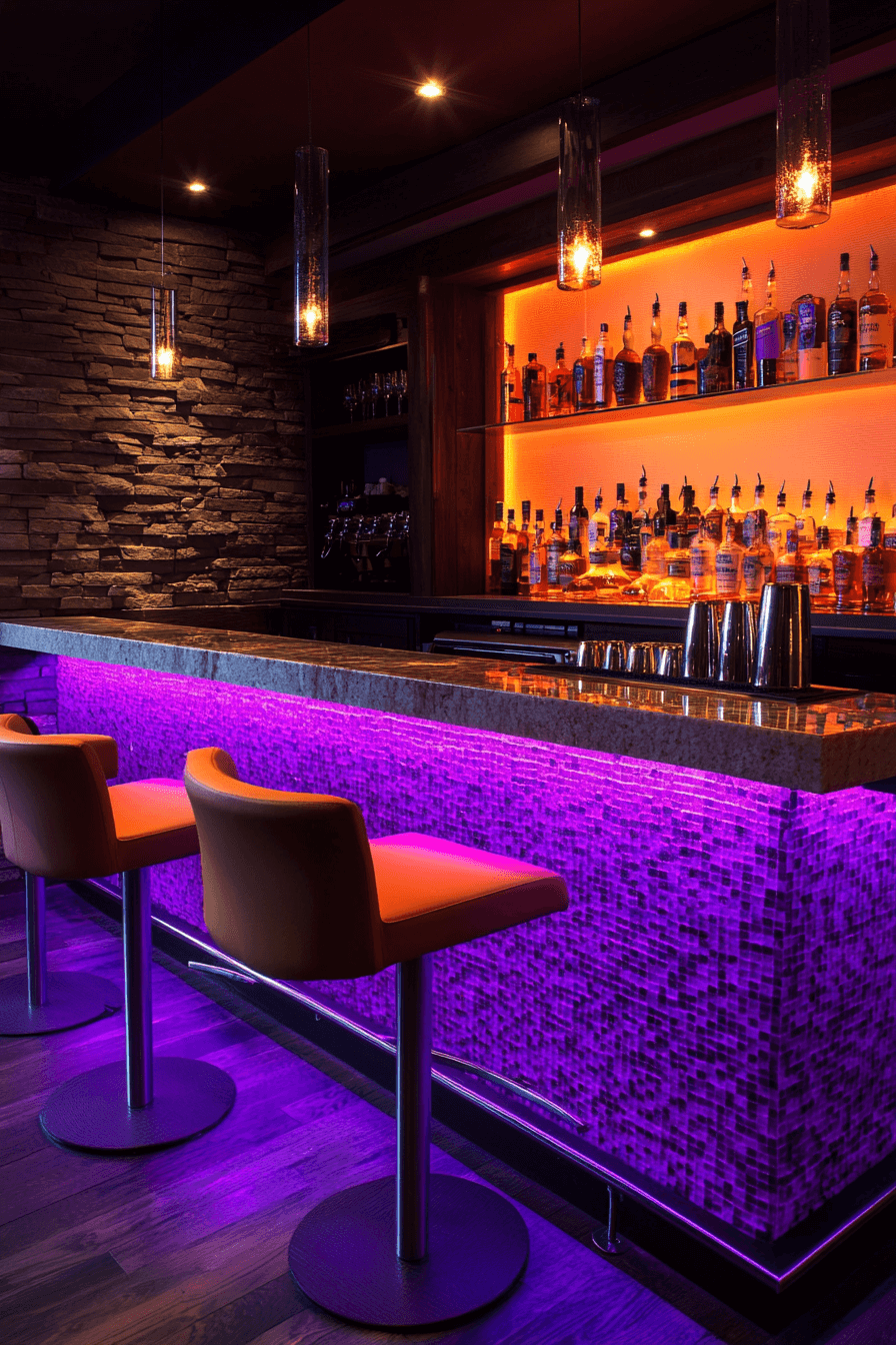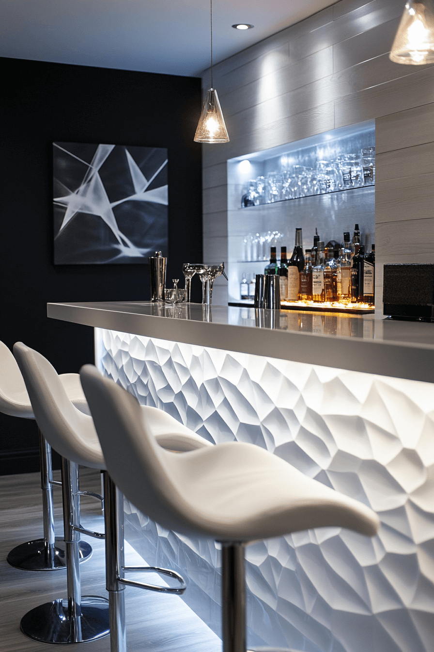 Futuristic flair redefines basement bar ideas through innovative lighting, metallic finishes, and tech-forward features that create an immersive environment. LED accents add depth and drama while highlighting architectural lines. Integrated sound and entertainment systems enhance the experience. The space feels bold, modern, and forward-thinking. This design suits homeowners who enjoy cutting-edge aesthetics. Explore futuristic basement bar ideas that feel ahead of their time.