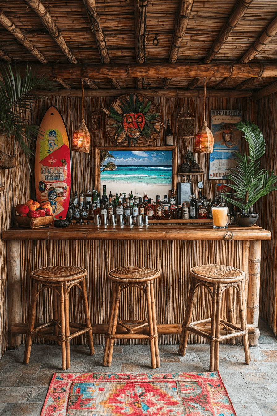 Relaxed vacation energy transforms basement bar ideas inspired by tropical escapes, where natural textures, playful accents, and warm lighting create an effortless island vibe. Bamboo details and colorful decor add personality without clutter. The atmosphere feels casual, cheerful, and welcoming. This style works beautifully for informal gatherings and stress-free entertaining. The bar becomes a place to unwind and connect. Discover tropical basement bar ideas that bring island warmth indoors.