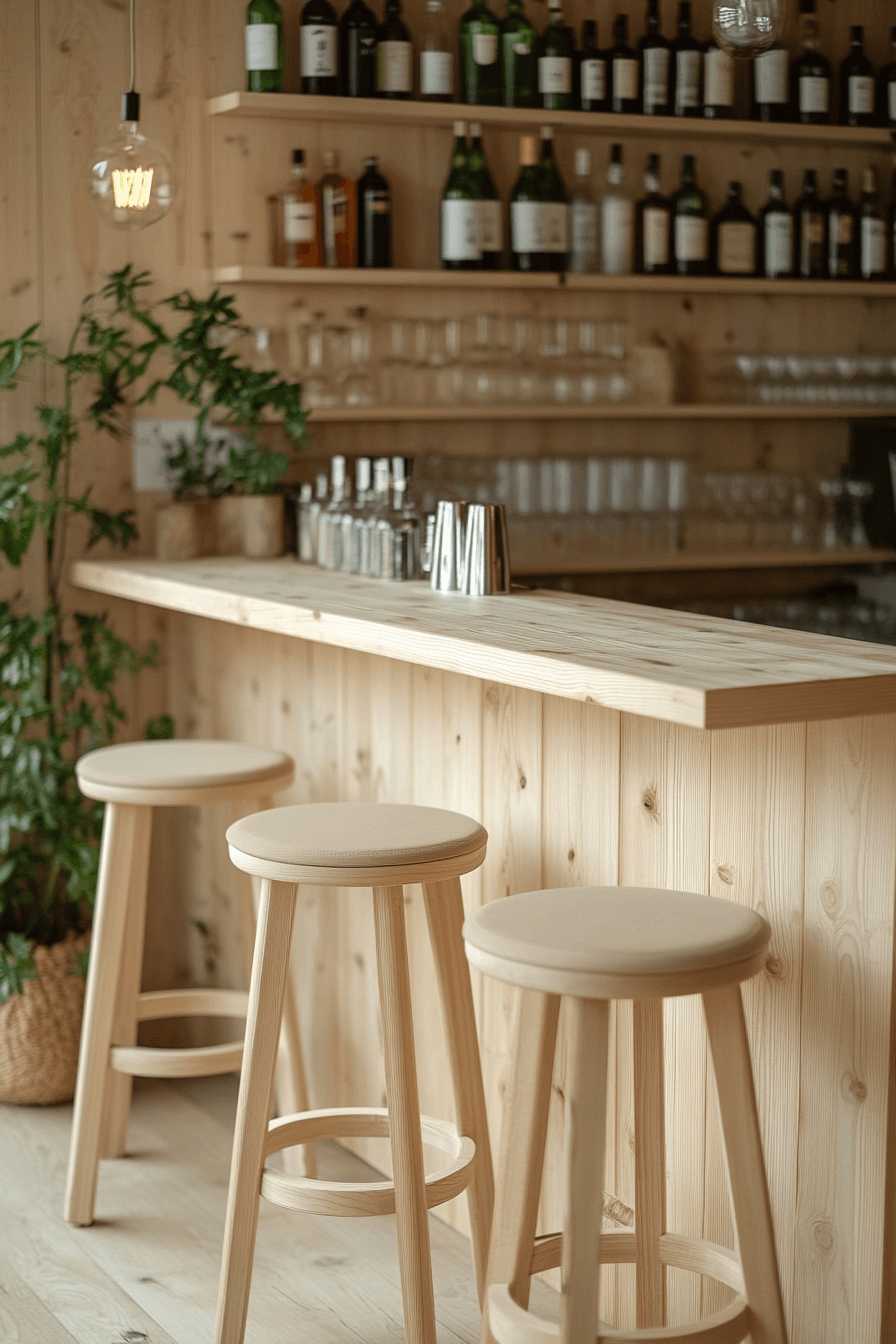 Calm balance defines basement bar ideas rooted in Scandinavian design, where light woods, soft neutrals, and clean lines create a welcoming atmosphere. Cozy textiles and subtle decor soften the minimal aesthetic. The space feels bright, open, and comfortable. Every element serves a functional purpose. This design supports relaxed, intimate gatherings. Explore Scandinavian basement bar ideas that feel effortlessly inviting.