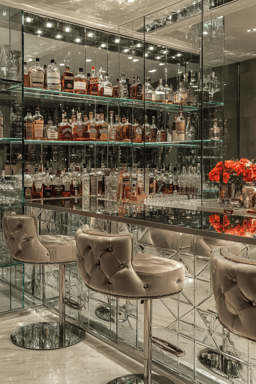 Visual openness enhances basement bar ideas that rely on reflective materials, where mirrored walls and glass shelving expand the sense of space. Bottles and barware become part of a curated display. Light moves freely throughout the room, creating a glamorous effect. The bar feels spacious and refined. This style suits sophisticated entertaining. Discover mirror-forward basement bar ideas that maximize impact.