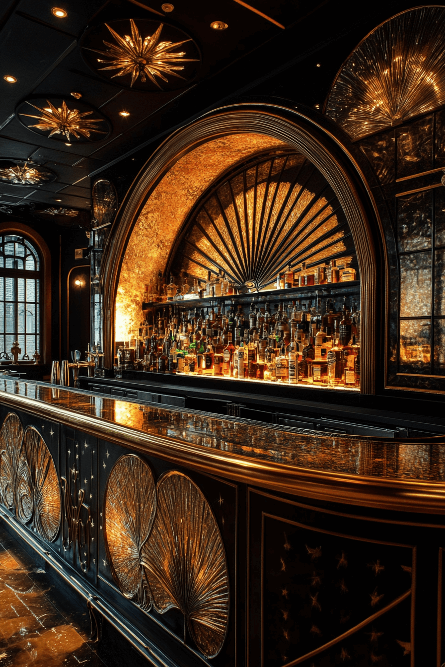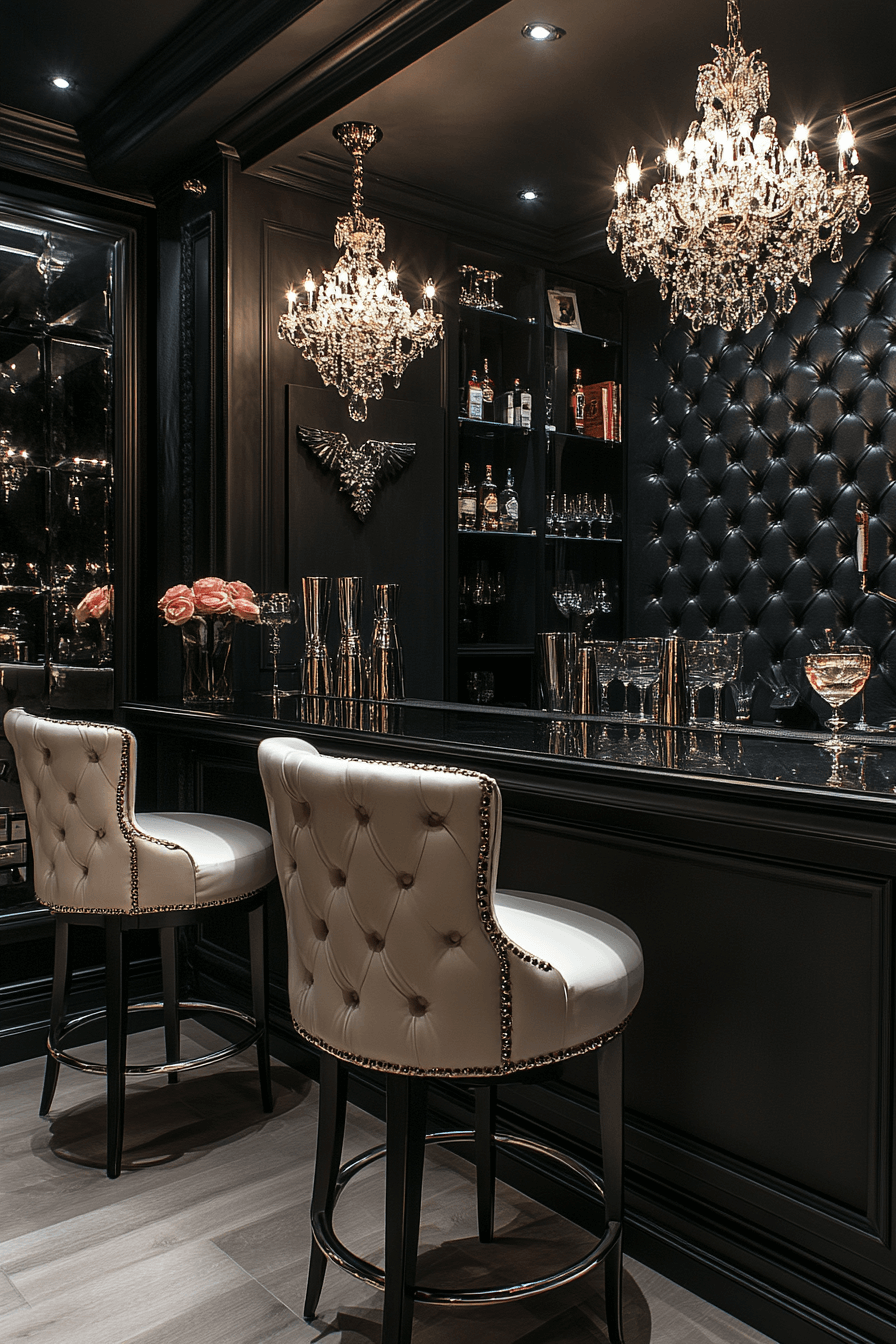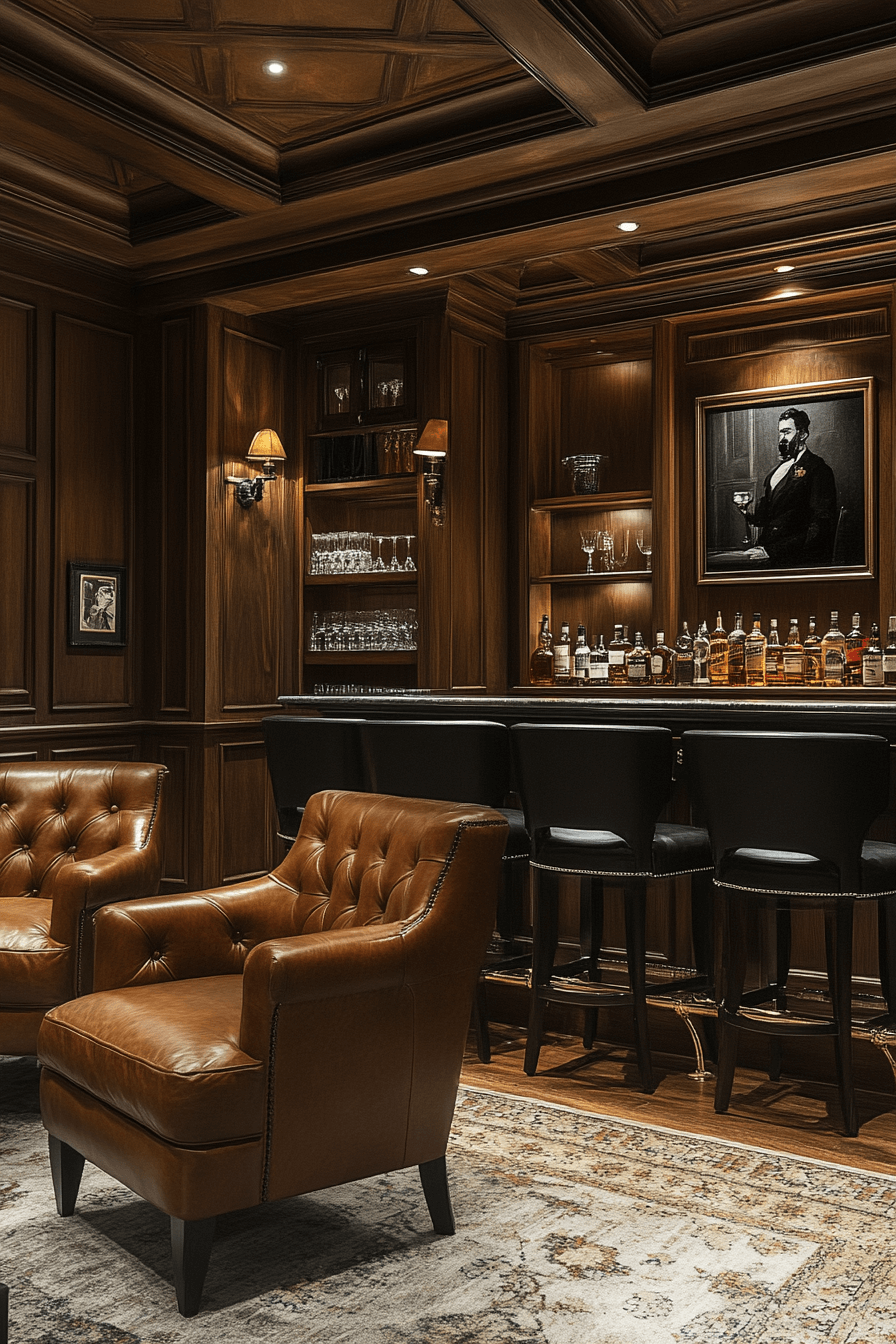 Bold luxury characterizes basement bar ideas inspired by Gatsby-era glamour, where dramatic contrasts and opulent materials set a celebratory tone. Art Deco elements add structure and elegance. The space feels grand yet inviting. This style is ideal for hosting unforgettable gatherings. Every detail feels intentional and dramatic. Discover Gatsby-inspired basement bar ideas that impress.