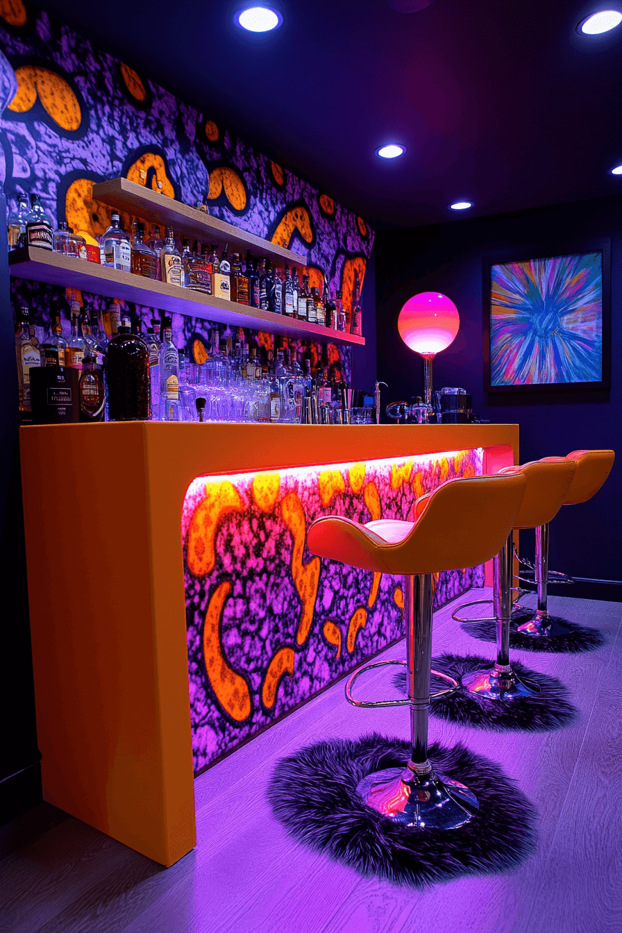 Playful nostalgia shapes basement bar ideas inspired by retro design, where bold colors, expressive patterns, and vintage furnishings create a lively atmosphere. Music-focused decor enhances the sense of fun and personality. The space feels energetic and expressive. This style celebrates individuality and joy. It is ideal for hosts who love bold character. Discover retro basement bar ideas filled with personality.