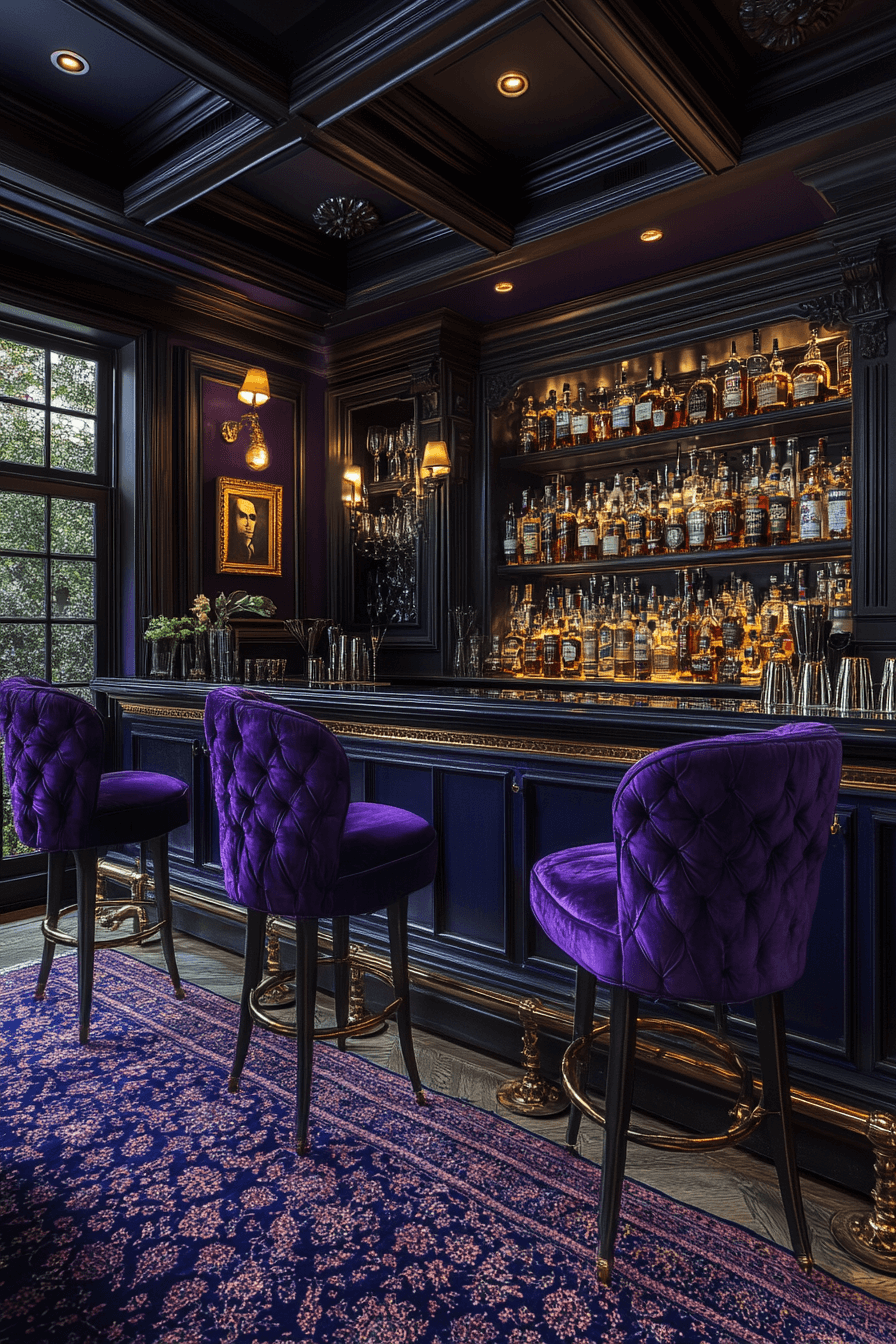 Dramatic richness defines basement bar ideas that embrace jewel-toned palettes, where velvet textures, moody lighting, and metallic accents create an indulgent ambiance. Deep colors add depth and intensity without overwhelming the space. The bar feels luxurious and inviting. This design is perfect for statement gatherings. Every detail feels intentional and bold. Explore jewel-toned basement bar ideas that captivate the senses.